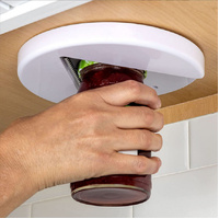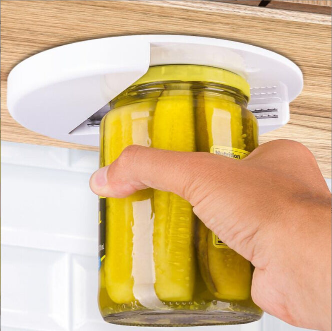 This wall-mounted jar opener saves kitchen space while easily opening tight lids, ideal for cabinets or table bottoms as a hands-free kitchen helper.Space-Saving Under-Mount DesignInstalls under kitchen cabinets or table bottoms (via adhesive or screws), keeping countertops clutter-free and within easy reach.Universal Lid CompatibilityFeatures a serrated clamp that fits most jar lid sizes (glass jars, cans, etc.), gripping tightly to twist even stubborn lids with minimal effort.Easy One-Hand OperationPlace the jar lid into the clamp, then twist the jar with one hand—no need for extra strength, perfect for seniors or those with limited hand mobility.Material: Durable plastic + serrated metal clampColor: White