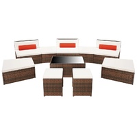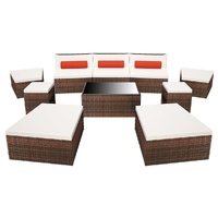 NOW $1,027.64This modular poly rattan garden furniture set combines style and functionality, and will become the focal point of your garden or patio. The whole furniture set has been designed to be used outdoors year-round. Thanks to the weather-resistant and waterproof PE rattan, the lounge set is easy to clean, hard-wearing and suitable for daily use. The sofa set features a sturdy powder-coated steel frame, which is highly durable. It is also lightweight and modular, which makes it completely flexible and easy to move around to suit any setting. You can set it up to form a garden sofa or a sun lounger set, but also in various other configurations. The thick, removable cushions and pillows are highly comfortable. Delivery includes 3 seat sections, 2 middle tables, 1 lift-up table, 2 footstools, 2 stools, 9 seat cushions, 3 backrest pillows and 3 lumbar pillows. Note: We recommend covering the set during rain, snow and frost.
