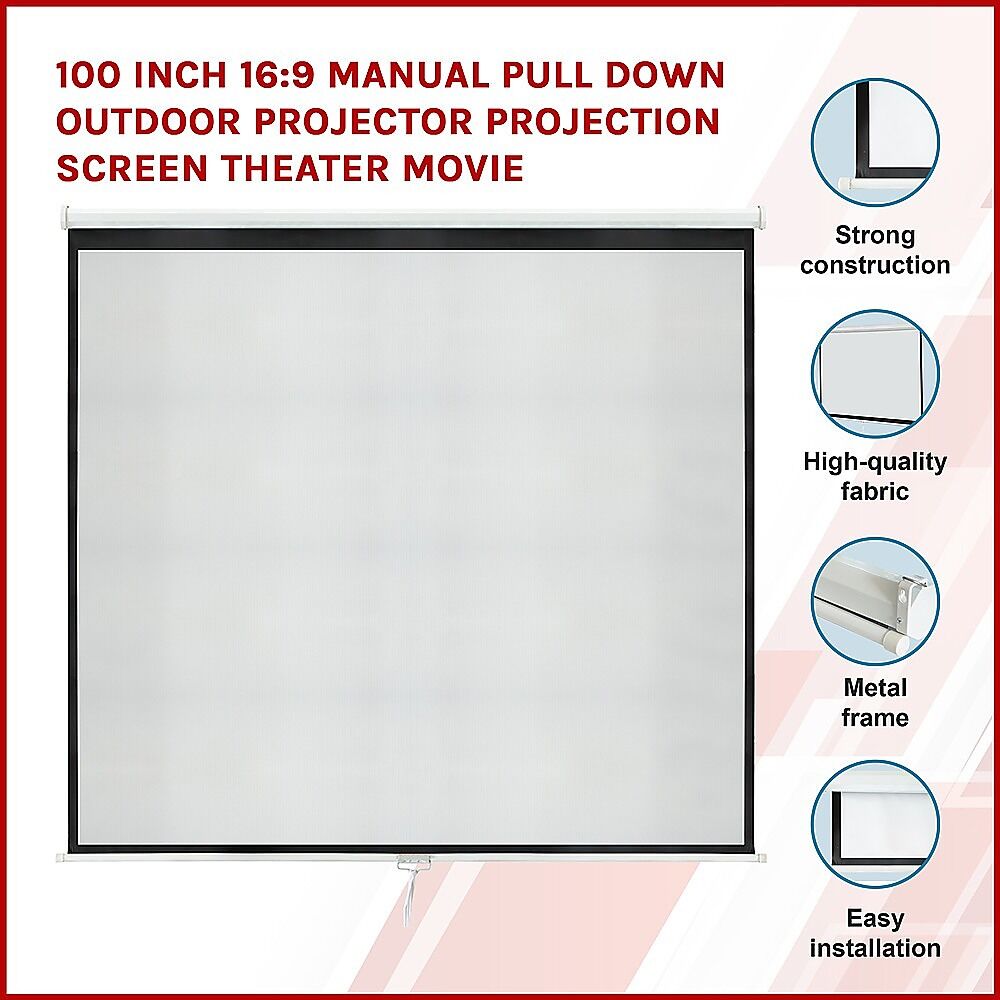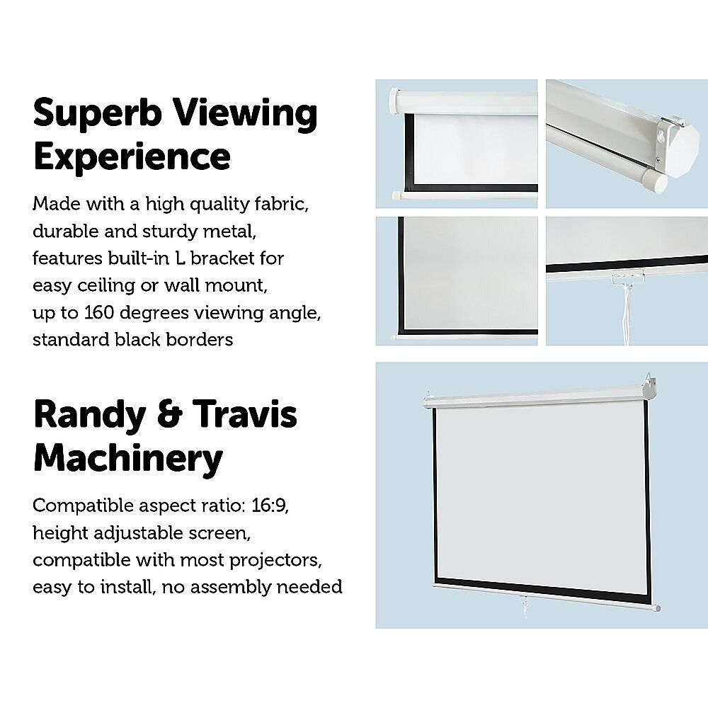 $134.99Whether it's for viewing old slides or films on the big screen, this projection screen from Randy Travis Machinery is perfect for popcorn time. Both ceiling- and wall-mountable for use inside and out, this screen will provide you with hours of fun with your family and friends without having to squint. So, instead of paying high ticket prices at the theatre, save money and watch your favourite movies right at home. Measuring 100 inches across the diagonal in a 16.9 widescreen format, it allows everyone to enjoy home movies and videos from anywhere in the room. With a 1.1 gain and a viewing angle up to 160 degrees, it prevents hot spots and provides the utmost in clarity and image reproduction.