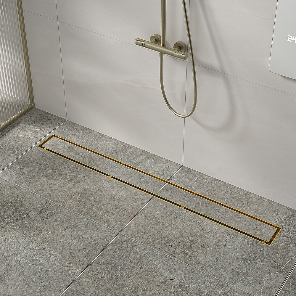 The practical yet eye-catching brushed brass shower grate features a frameless design that allows it to be seamlessly inserted into the shower's tiling configuration. The grate with its high quality construction provides durability and longevity as well as resistance to corrosion.