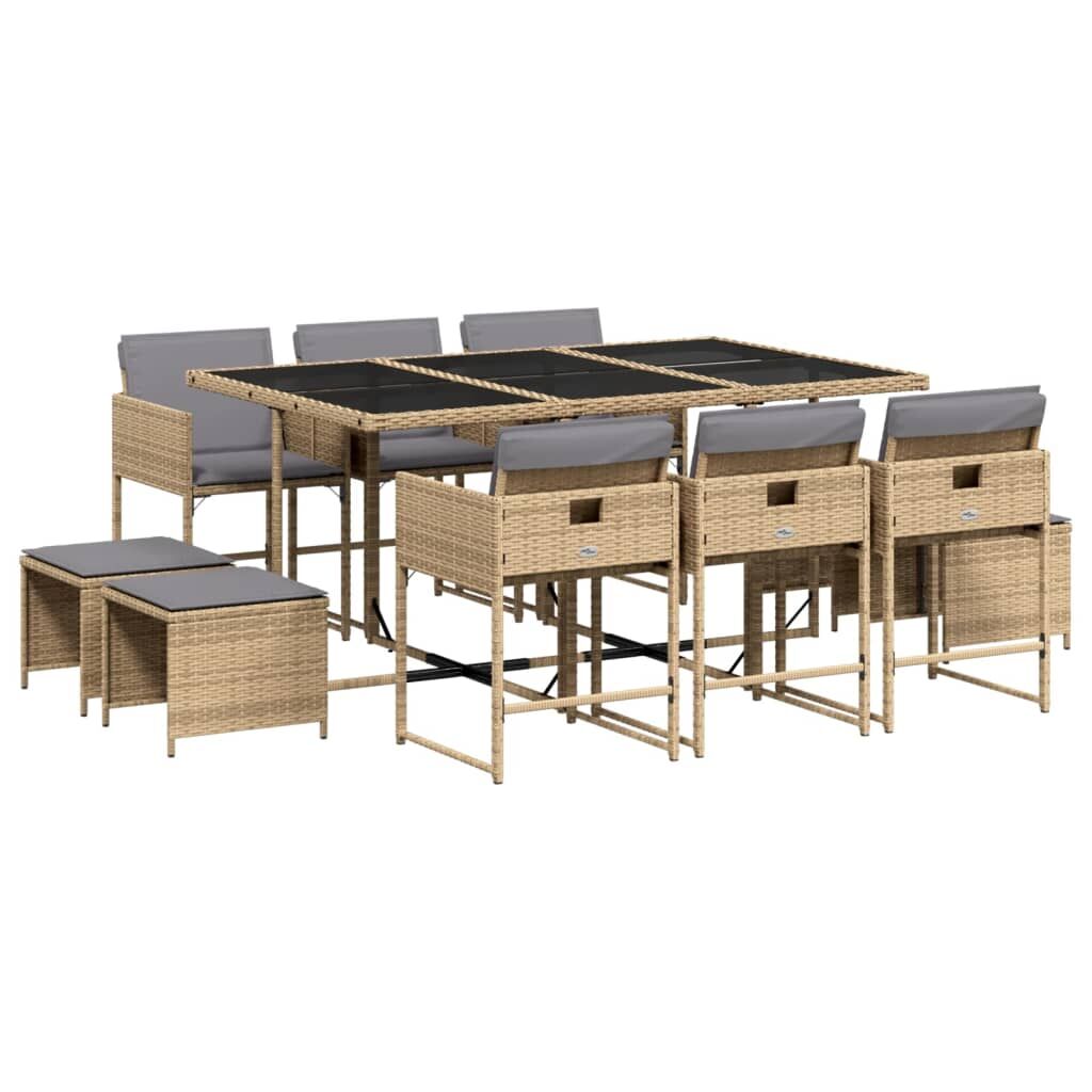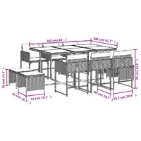 $590.39This garden dining set is a great choice for al fresco dining or just relaxing in the garden, backyard, or on the patio. Durable material: PE rattan, also known as poly rattan, is a strong, low-maintenance synthetic material that looks like natural rattan. It's lightweight, easy to clean, and commonly used for outdoor furniture due to its durability and weather-resistant properties.Compact storage: These chairs have a flap backrest that can be folded down, making it easy to store them under the table. When folded, they neatly fit under the table, forming a space-saving cube shape. Additionally, the stools can also be stored under the chairs, further maximising space efficiency.Comfortable seat experience: This outdoor furniture, complete with thickly padded cushions, offers a comfortable seating experience.Removable and washable cover: These seat cushions feature removable covers for easy washing and maintenance. The cushion covers have a flap at the back for easy attachment to the backrests.Glass tabletop: The outdoor table's top is made from strong and durable tempered glass, making it easy to clean with a damp cloth and adding a touch of elegance to your outdoor space. Good to know: To make sure your outdoor furniture stays beautiful, we recommend protecting it with a waterproof cover.