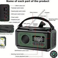 Functions: AM/FM/NOAA weather alerts, SOS alarm, flashlight, phone charger, reading lamp, compass
