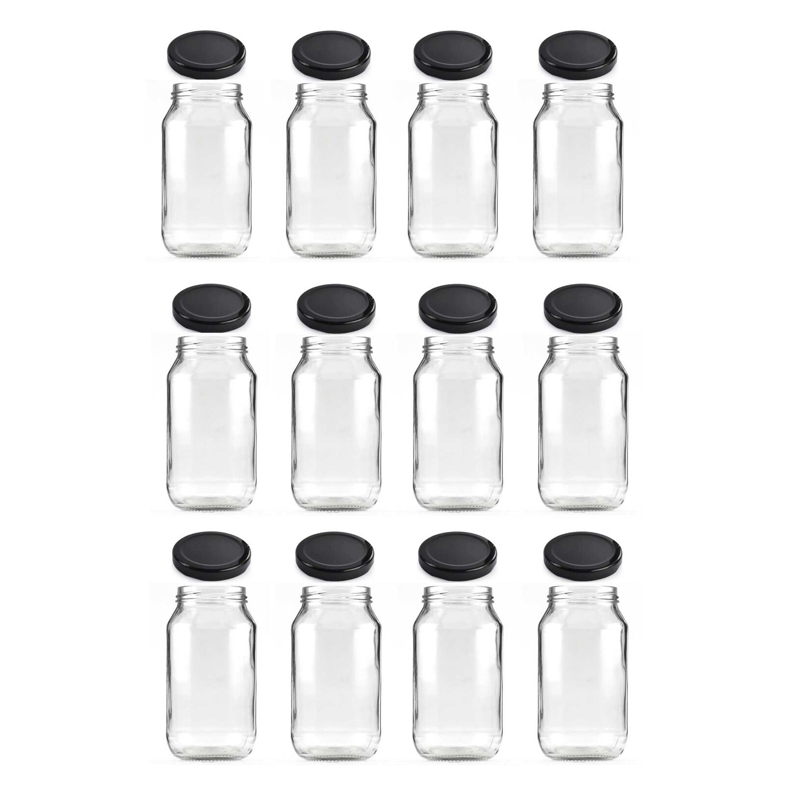 12x 500ml Flint Glass Jars with Black Metal Twist Finish Lids.