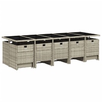 $1,150.19This garden dining set is a great choice for al fresco dining or just relaxing in the garden, backyard, or on the patio. Durable material: PE rattan, also known as poly rattan, is a strong, low-maintenance synthetic material that looks like natural rattan. It's lightweight, easy to clean, and commonly used for outdoor furniture due to its durability and weather-resistant properties.Compact storage: These chairs have a flap backrest that can be folded down, making it easy to store them under the table. When folded, they neatly fit under the table, forming a space-saving cube shape. Additionally, the stools can also be stored under the chairs, further maximising space efficiency. Comfortable seat experience: This outdoor furniture, complete with thickly padded cushions, offers a comfortable seating experience.Removable and washable cover: These seat cushions feature removable covers for easy washing and maintenance.Glass tabletop: The outdoor table's top is made from strong and durable tempered glass, making it easy to clean with a damp cloth and adding a touch of elegance to your outdoor space. Good to know: To make sure your outdoor furniture stays beautiful, we recommend protecting it with a waterproof cover.