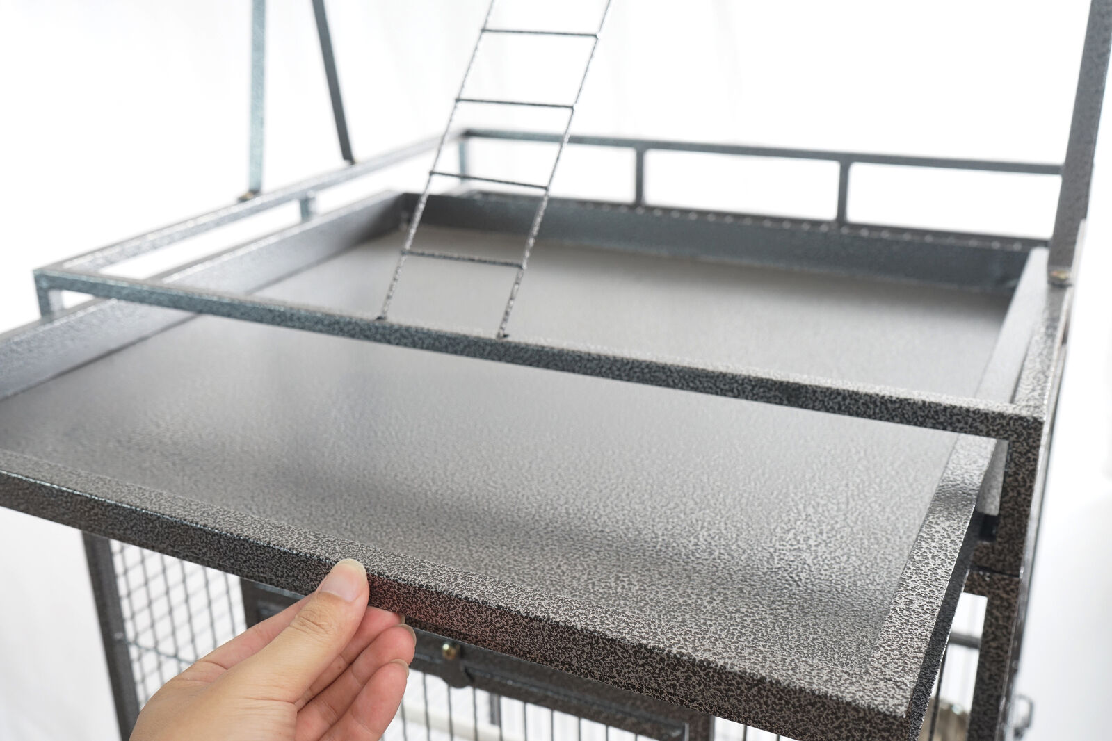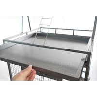 Taking care of birdis made easywith one large access door and two side doors to reach inside the five food and water bowls and take them out for refillingor cleaning. Cleaning is hassle-free with the slide-out top and bottom tray that can also be removed.