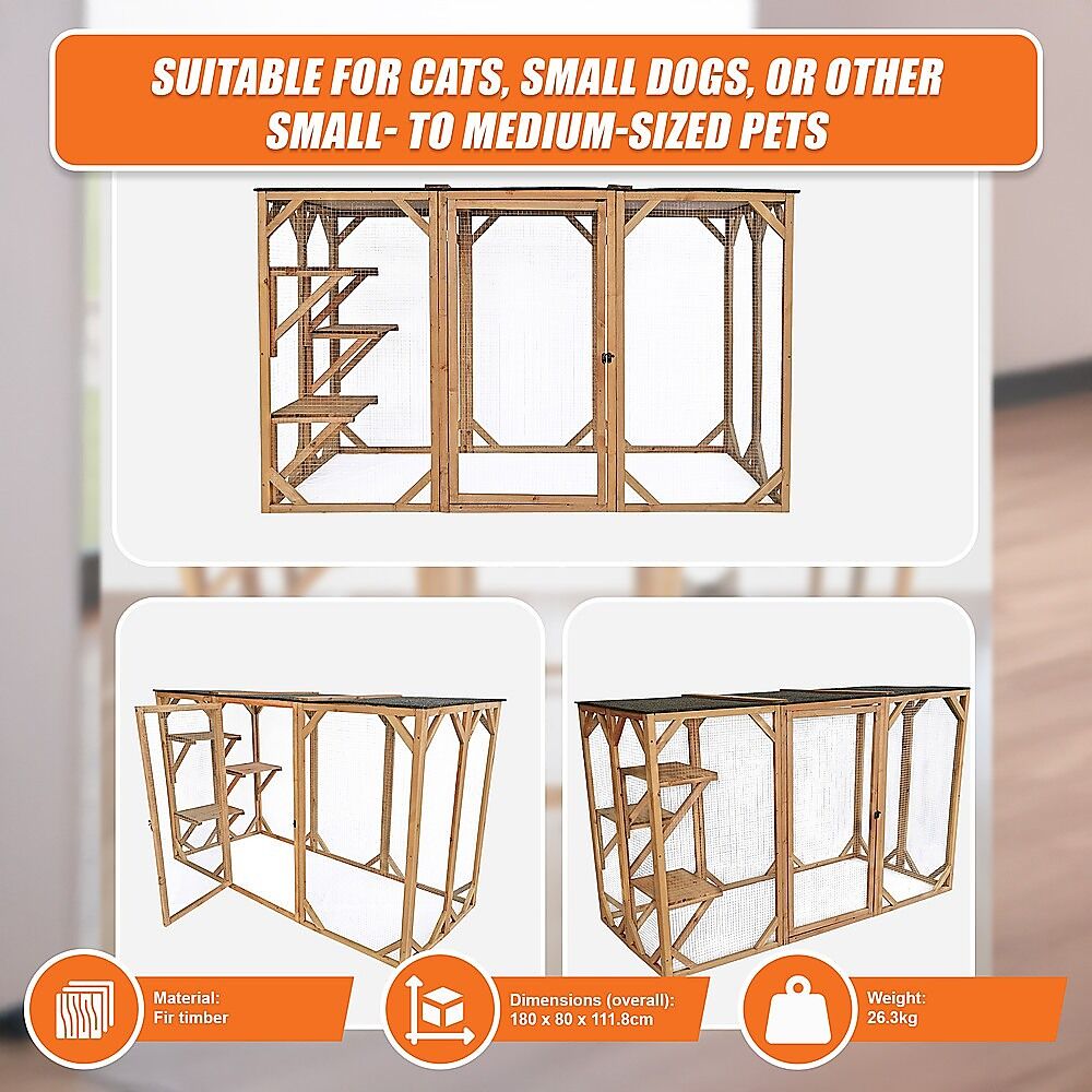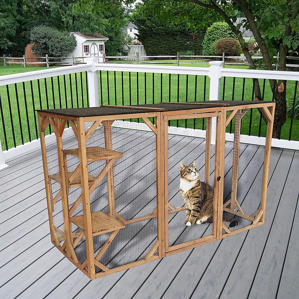 $526.49Have you ever wanted to allow your cats or small dogs to play outside but were afraid that they'd get out into traffic or fall victim to predators? With this completely enclosed playpen, you never have to worry about their safety. They'll enjoy the fresh air, sunshine, sights, and sounds of nature without the dangers of outdoor life. Crafted from natural fir timber and wrapped in metal wire, this sturdy patio-like enclosure will keep your pets safely inside. Three platforms provide the perfect perch for Kitty to relax and watch the world go by. Overhead, an asphalt-covered roof protects your pets from rain and the hot summer sun.