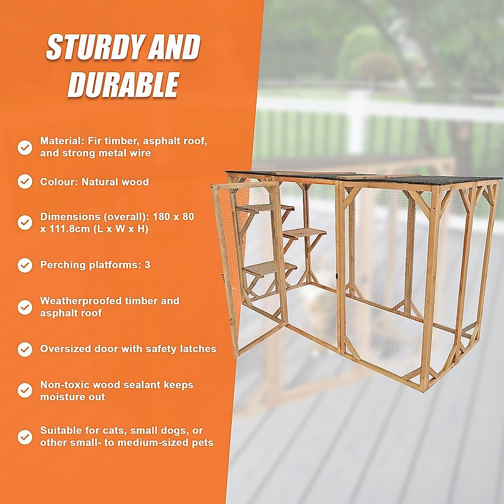 Its rustic, natural design makes it an attractive addition to your garden or backyard, while its durable construction ensures that it will give your family pets years of use. Coated with a water-resistant, non-toxic sealant, the timber frame won't warp or split like untreated timber. Its generous ground coverage can easily accommodate multiple pets, and its large front door allows you to enter and exit easily. If you want to give your pets the benefit of being out in nature while staying safe, this is the perfect solution. Give your pets the gift of safety today!