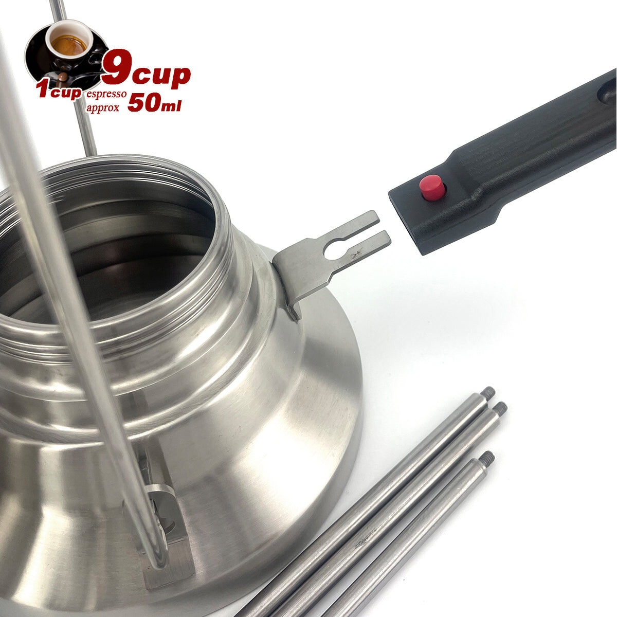 Large Capacity - Suitable for family use - Camping 2-in-1 Mocha coffee maker has a large capacity and can brew 9 cups(about 450 ml ) of authentic espresso at one time. As a kettle, it can brew 12 cups of water(about 600 ml ) at one time.