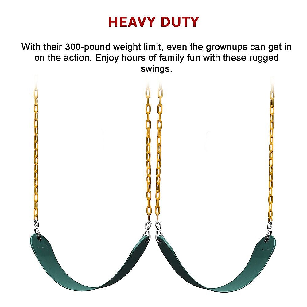 Designed with an eye-catching yellow plastisol coating to prevent finger pinches, these sturdy 2/0 zinc-plated chains should last for years. The copolymer plastic seat is both comfortable and safe. With their 300-pound weight limit, even the grownups can get in on the action. Enjoy hours of family fun with these rugged swings. Use them with low-friction swing hangers for maximum safety and enjoyment.
