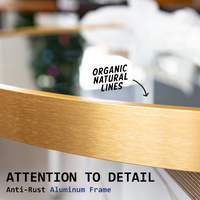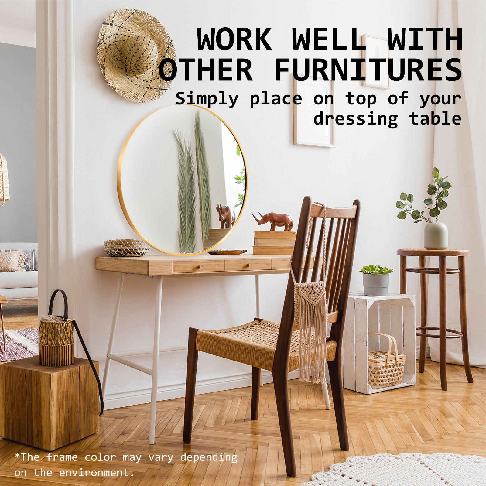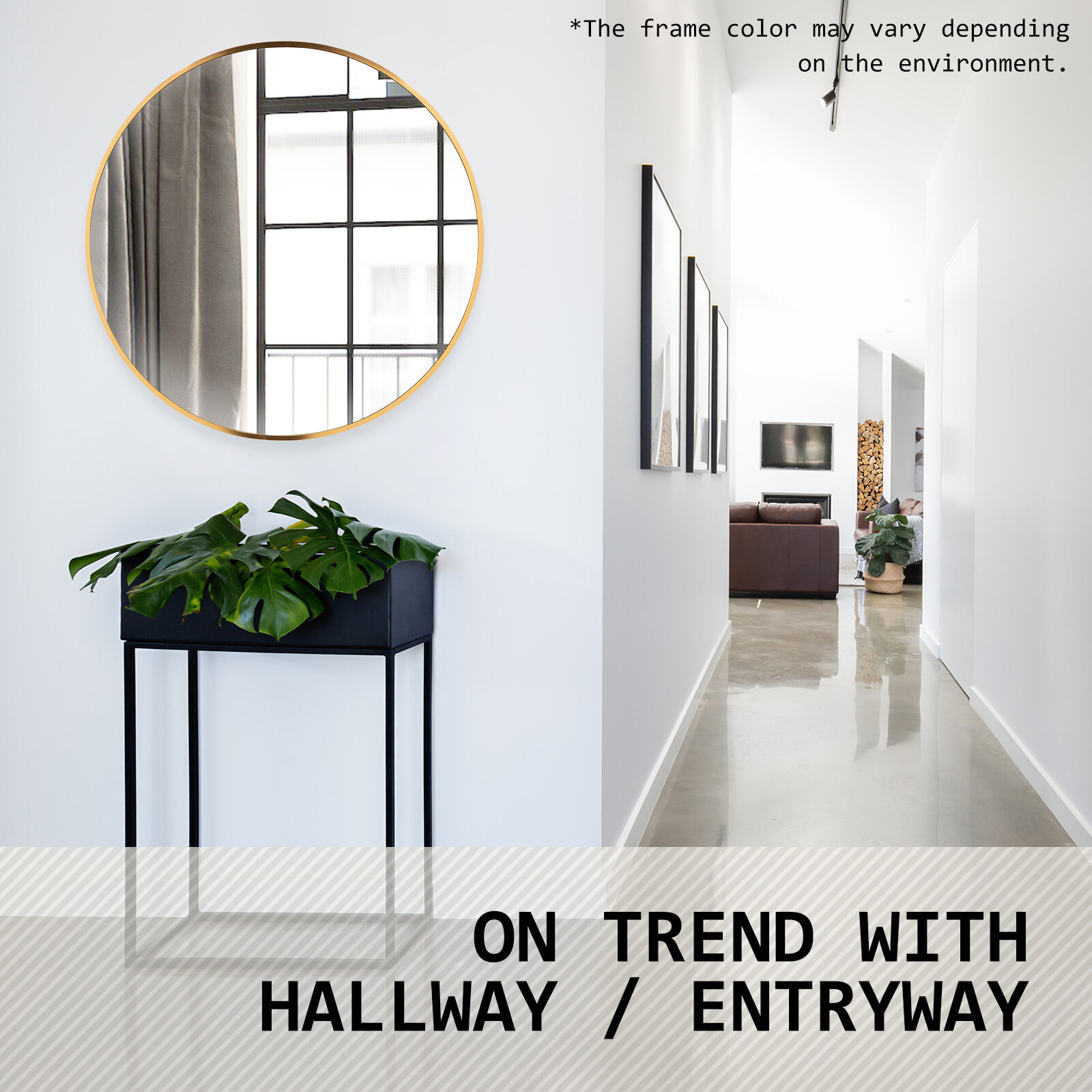 Please note it's neither brass gold nor rose gold. Our aluminum mirror, part of the gold color theme, has a unique shade within the gold spectrum. The frame color may vary with light due to aluminum's reflective nature.