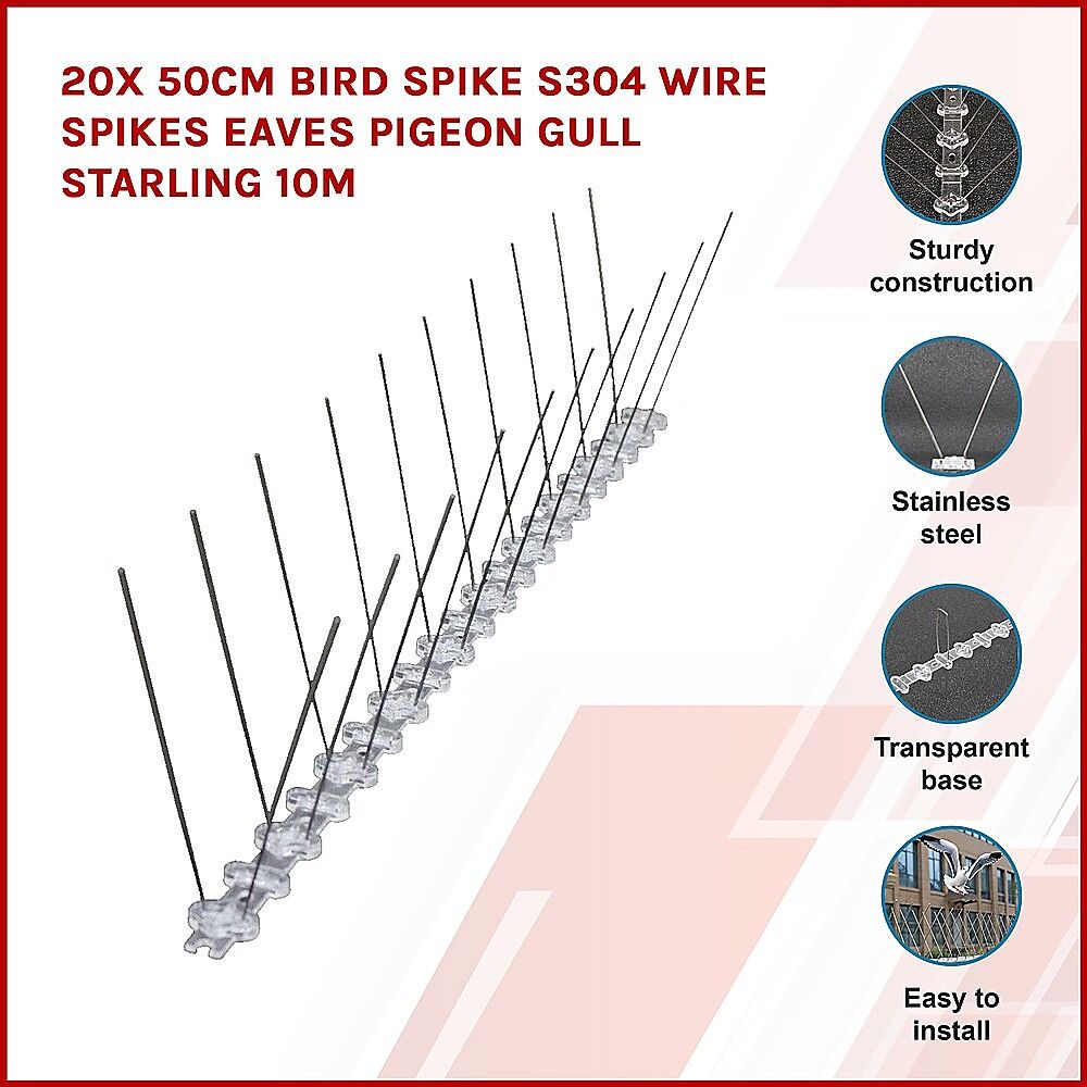 $77.39Love birds but don't like the mess pigeons, gulls, or crows make when they take up residence on your property? These bird spikes from Randy Travis Machinery might look scary, but they're completely humane. Although they don't hurt the birds, these spikes keep roosting birds and their germ-spreading droppings away from your home. It's not just the germs. Bird droppings are corrosive, eating through almost every kind of material over time. Protect your home or business against the damage roosting birds can do with these highly effective spikes. They serve as a physical barrier to them, keeping them from perching on your windowsills, ledges, signs, gutters, pipes, and chimneys.