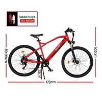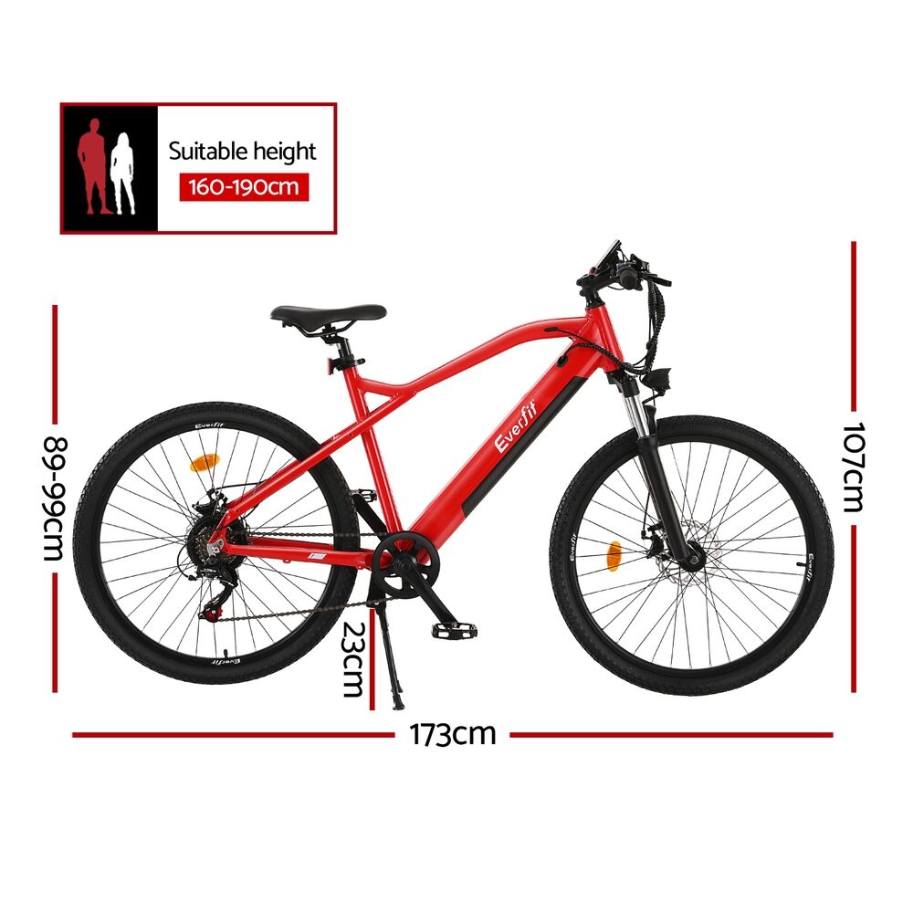 frame bike is easy to assemble, water-resistant, and perfect for mountain biking or exploring urban roads. The powerful 250W motor is paired with SHIMANO 7-speed gears and derailleur, making any terrain easy to tackle. With a 36V 10.4Ah removable rechargeable Li-ion battery, enjoy speeds up to 25km/h and a range of up to 60km on a single charge. Stay informed with the smart LED display panel and travel comfortably with the suspension front fork, height-adjustable saddle, and front and rear disc brakes. Our electric bike even comes with a built-in headlight and reflector for safe riding, while the durable wheels and tyres provide a smooth ride on a wide range of terrains. Suitable for riders with heights between 160-190cm and a weight capacity of 120kg. Charge time is between 6-8 hours. Get your electric mountain bike today for an unforgettable ride.