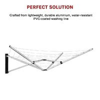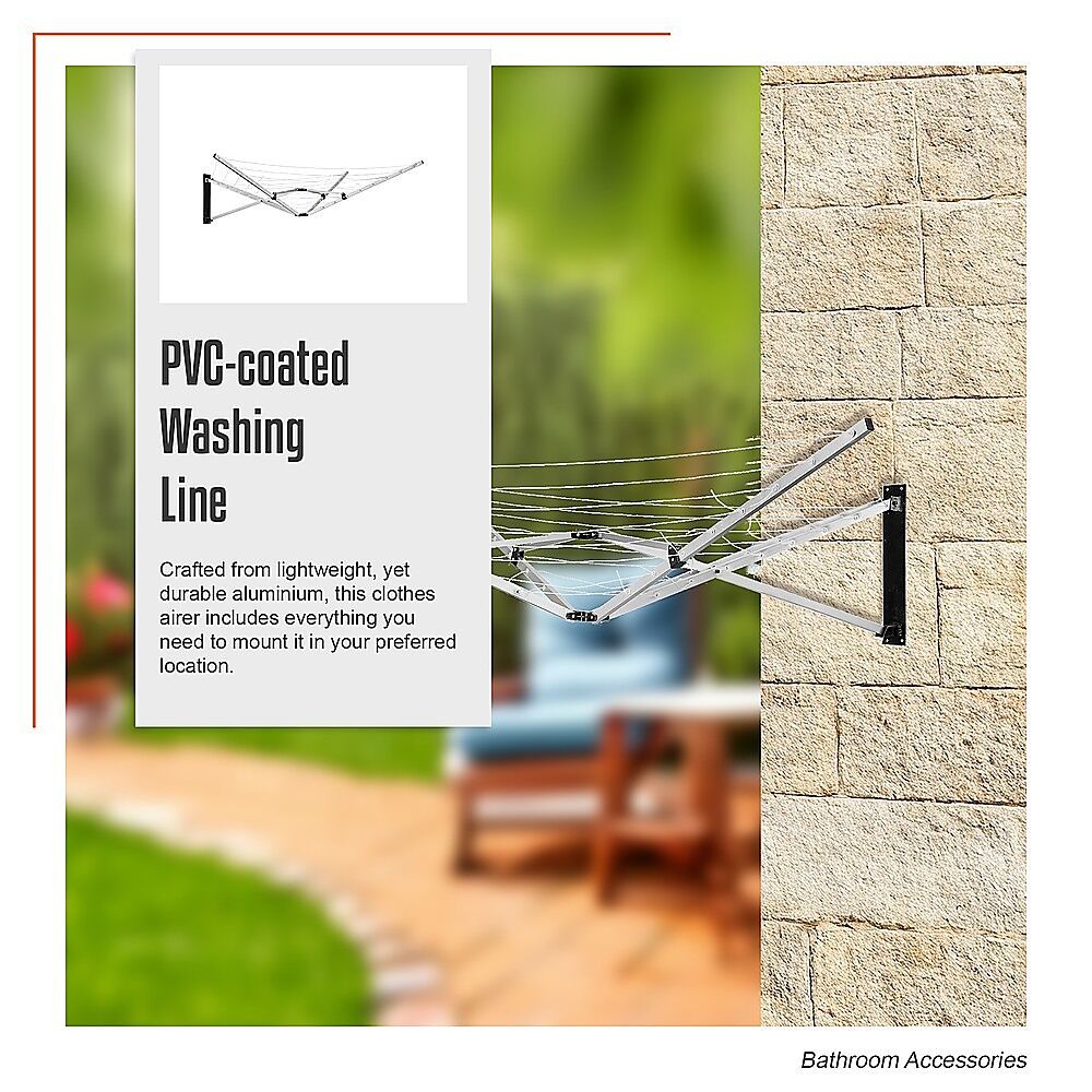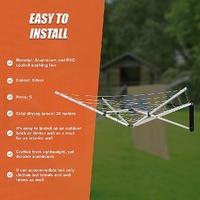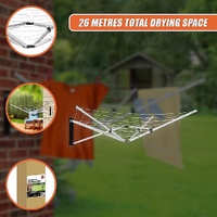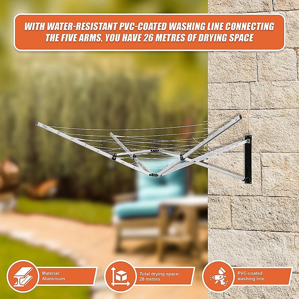 With water-resistant PVC-coated washing line connecting the five arms, you have 26 metres of drying space enough to handle even the largest loads. Crafted from lightweight, yet durable aluminium, this clothes airer includes everything you need to mount it in your preferred location.