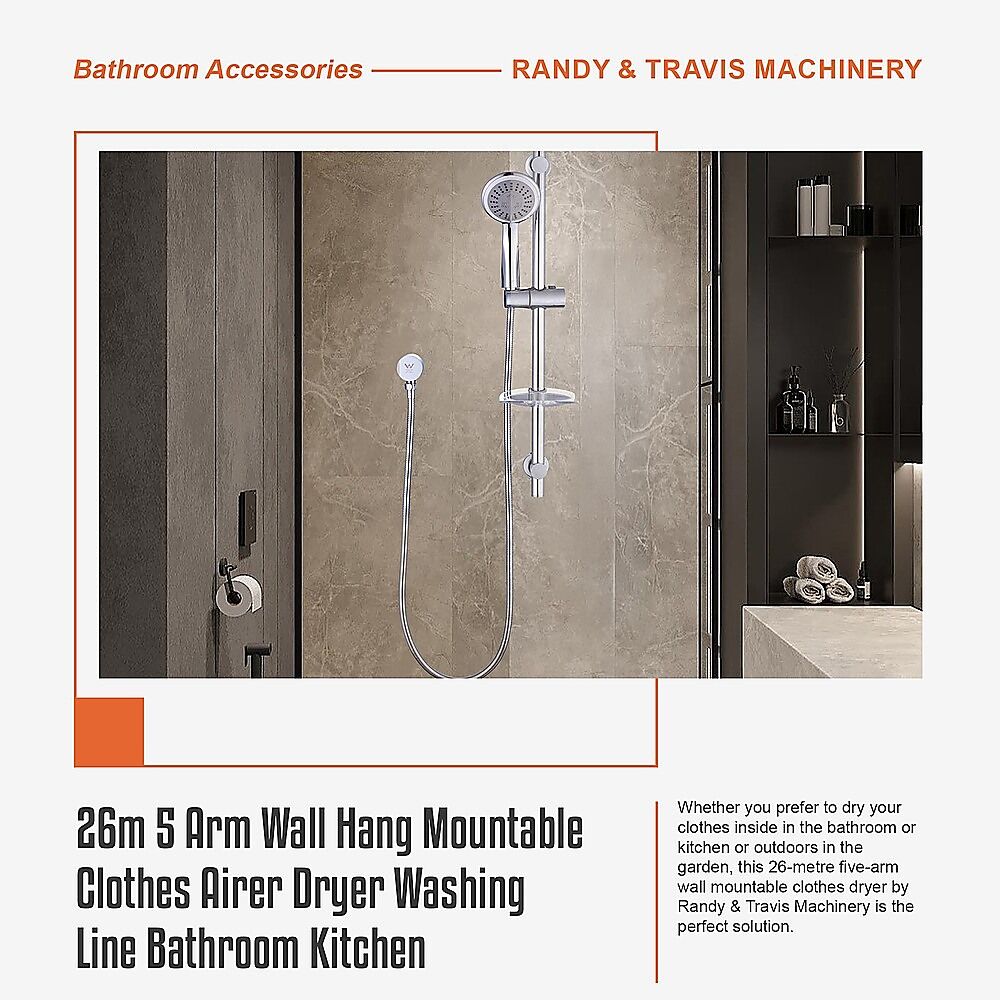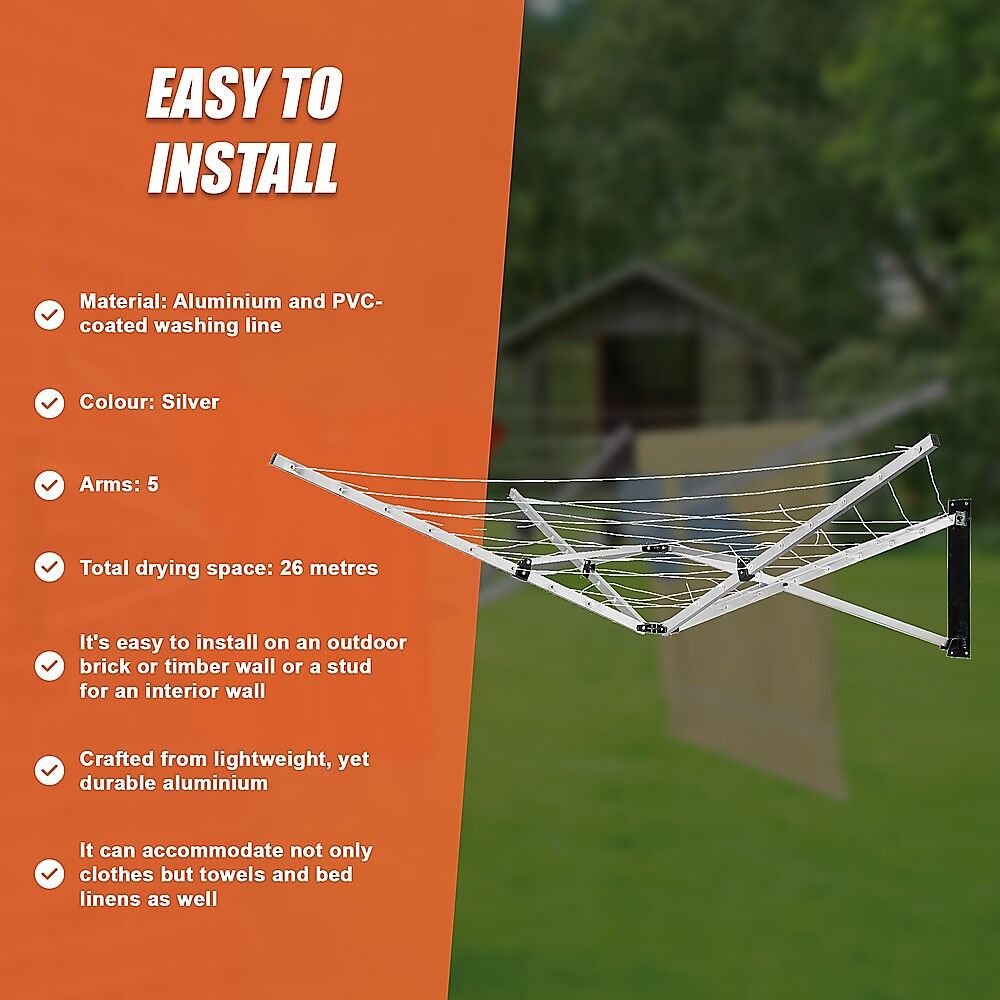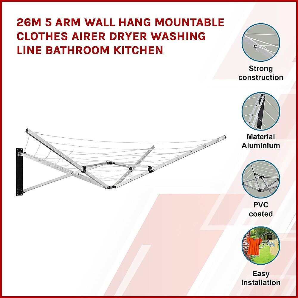 $77.39Whether you prefer to dry your clothes inside in the bathroom or kitchen or outdoors in the garden, this 26-metre five-arm wall mountable clothes dryer by Randy Travis Machinery is the perfect solution. It's easy to install on an outdoor brick or timber wall or a stud for an interior wall.