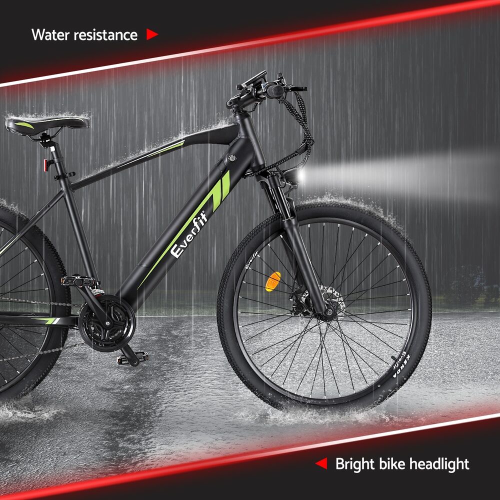 frame bike is easy to assemble, water-resistant, and perfect for mountain biking or exploring urban roads. The powerful 250W motor is paired with SHIMANO 21-speed gears and derailleur, making any terrain easy to tackle. With a 36V 10.4Ah removable rechargeable Li-ion battery, enjoy speeds up to 25km/h and a range of up to 60km on a single charge. Stay informed with the smart LED display panel and travel comfortably with the suspension front fork, height-adjustable saddle, and front and rear disc brakes. Our electric bike even comes with a built-in headlight and reflector for safe riding, while the durable wheels and tyres provide a smooth ride on a wide range of terrains. Suitable for riders with heights between 165-195cm and a weight capacity of 150kg. Charge time is between 6-8 hours. Get your electric mountain bike today for an unforgettable ride.