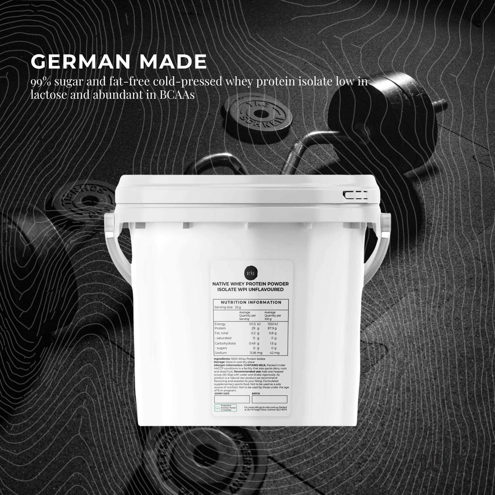 OurAustralianmade Whey Protein Isolate is99% sugar and fat-free cold-pressed whey protein isolate. No added sugars, low in lactose and abundant in BCAAs make it an excellent supplement to help recover from exercise, build toned muscle, and promote overall health and wellbeing.