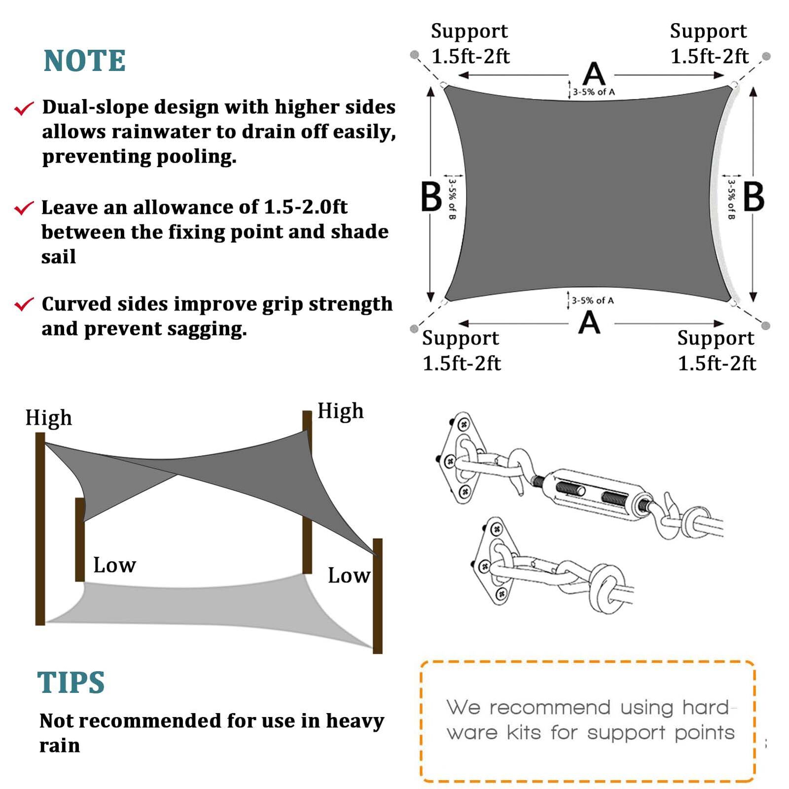 This sun shade is designed with curved edges to maximum tension; Every corner is sewed with 2 layers of nylon straps connected with durable stainless steel D ring, to avoid rip or break off.