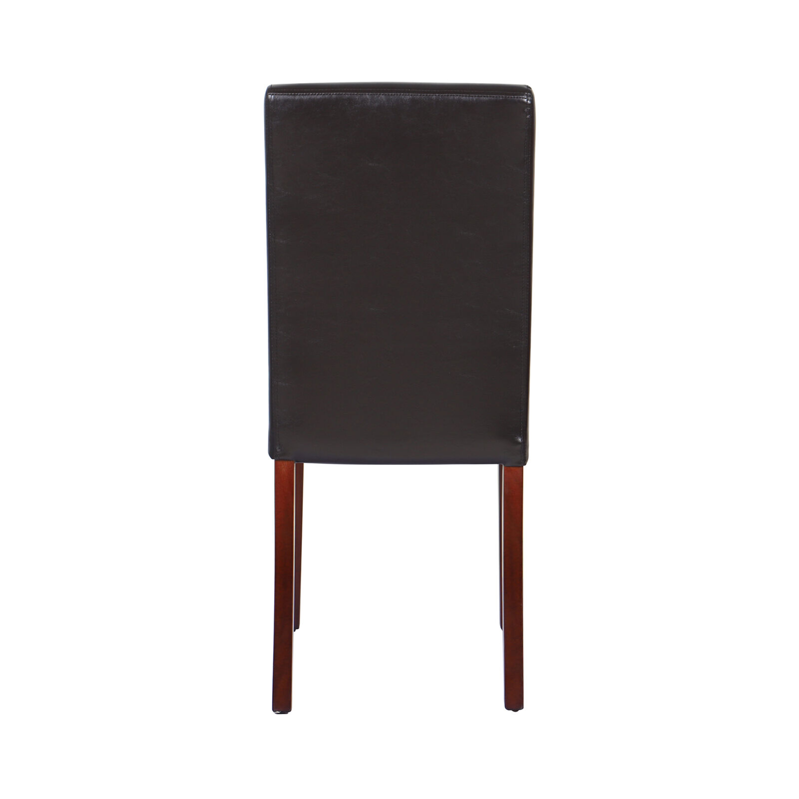 This contemporary, wooden dining chair is the ideal addition for your dining area. This generously sized chair features a padded, upholstered leatherette seat, mid high back rest and solid pine wood legs for strong support.
