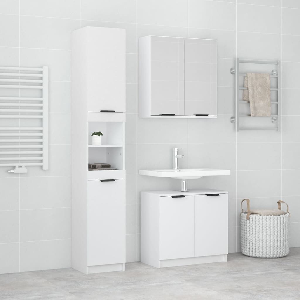 $290.69This attractive bathroom cabinet set, with ample storage space, features a stylish yet practical design. Easy-to-clean material: The engineered wood is of exceptional quality with a smooth surface and features strength, stability and resistance to moisture. Ample storage space: The storage space makes this bathroom furniture set easy to keep things organised. Stylish design: The clean lines and sleek design blend into your bathroom perfectly. Note:Screw(s) and plug(s) for inside the wall are not included. Seek and use screw(s) and plug(s) suitable for your walls. If you are uncertain, seek professional advice. Read and follow each step of the instruction carefully. Each product comes with an assembly manual in the box for easy assembly. Warning:In order to prevent overturning, this product must be used with the wall attachment device provided.