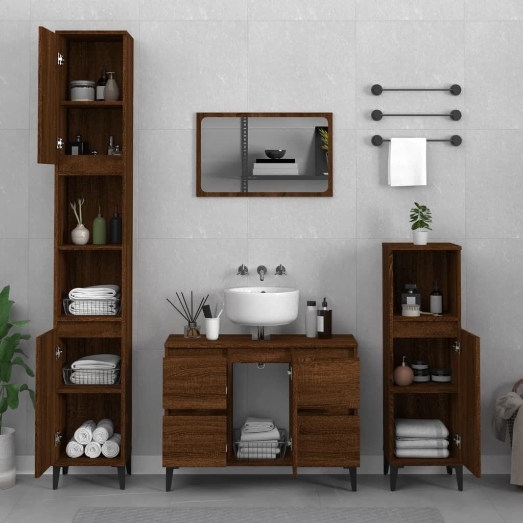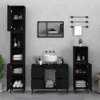NOW $292.94This stylish bathroom furniture set, featuring spacious storage space, is an excellent addition to your bathroom, giving it a tidy and striking appearance! Durable material: The engineered wood is of exceptional quality with a smooth surface and features strength, stability and resistance to moisture.Ample storage space: These bathroom cabinets offer ample storage space for keeping your bathroom supplies well organised.Metal feet: The metal feet add a modern and calm style to your interior while ensuring stability.Easy-to-clean surface: The bathroom unit is easy to clean with a damp cloth.Stylish design: The clean lines and sleek design blend into your bathroom perfectly. Warning:To prevent it being overturned, this product must be used with the provided wall attachment device. Good to know:Screws and plugs for inside the wall are not included. We advise to find and use screws and plugs suitable specifically for your walls. If you're not sure, you can consult with a professional. Please read and follow each step of the instructions.