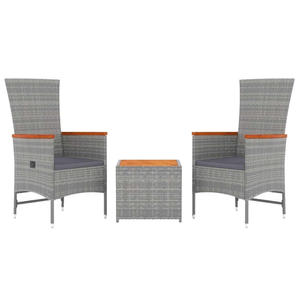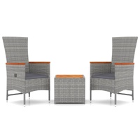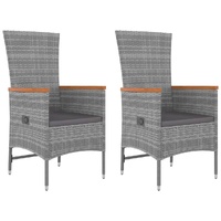 $322.70Seat cushion cover mater Garden chair:Colour: GreyMaterial: PE rattan, steel, solid acacia wood with an oil finishOverall dimensions: 60 x 58 x 108 cm (W x D x H)Seat size: 47 x 45 cm (W x D)Seat height from the ground: 43 cmArmrest height from the ground: 65/62 cmTable:Colour: GreyMaterial: PE rattan, powder-coated steel, solid acacia wood with an oil finishDimensions: 45 x 45 x 40 cm (W x D x H)Cushion:Colour: Dark greySeat cushion cover material: Fabric (100% polyester)Seat cushion filling material: FoamSeat cushion thickness: 4 cm Delivery contains:2 x Garden chair1 x Table2 x Seat cushion