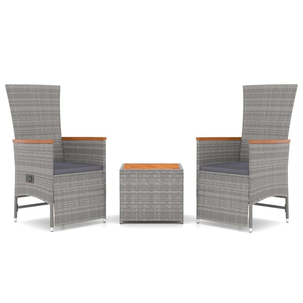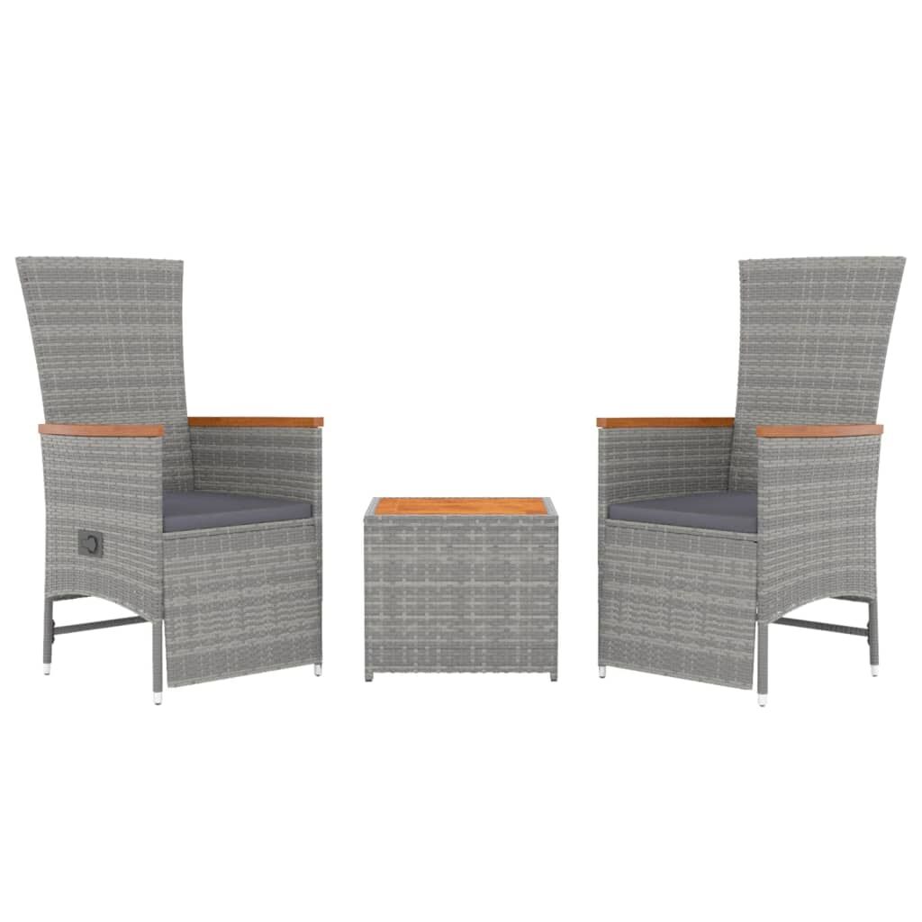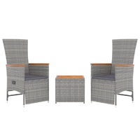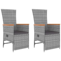 $337.58Cushion: Garden chair:Colour: GreyMaterial: PE rattan, steel, solid acacia wood with an oil finishSitting dimensions: 58 x 62 x 108 cm (W x D x H)Lying down dimensions: 58 x 121 x 96 cm (W x D x H)Seat size: 47 x 44 cm (W x D)Seat height from the ground: 43 cmArmrest height from the ground: 65/62 cmTable:Colour: GreyMaterial: PE rattan, powder-coated steel, solid acacia wood with an oil finishDimensions: 45 x 45 x 40 cm (W x D x H)Cushion:Colour: Dark greyCover material: Fabric (100% polyester)Seat cushion filling material: FoamSeat cushion thickness: 4 cm Delivery contains:2 x Garden chair1 x Table2 x Seat cushion