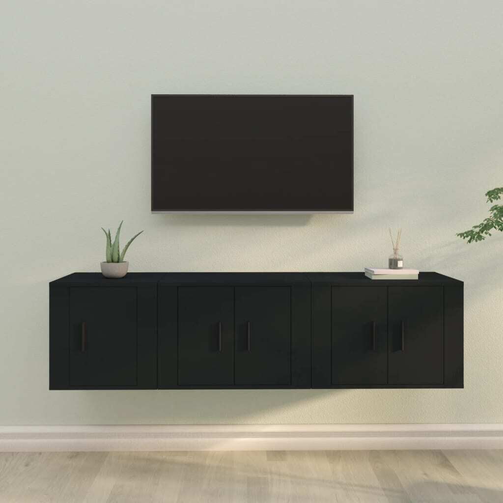 $165.25This classic TV cabinet set is designed to be a focal point of your room, featuring a trendy yet practical design. Sturdy material: The engineered wood is of exceptional quality with smooth surface and also features strength, stability and resistance to moisture. Made of engineered wood, these TV stands are easy to clean.Ample storage space: These TV units provide ample storage space to keep all your magazines, DVDs and any other items well organised.Wall-mounted design: These media cabinets don't take any floor space. You can hang them on the wall easily.Practical doors: Keep your essentials free from dust by hiding them behind the doors of the media units. Good to know:To make assembly as easy as possible, each product is delivered with a manual.Screws and plugs for inside the wall are not included. We advise to find and use screws and plugs suitable specifically for your walls. If you're not sure, you can consult with a professional. Please read and follow each step of the instructions.