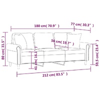 This 3-seater sofa, standing out with its modern design and throw pillows, will be an excellent place for chatting, watching TV or just relaxing. Soft velvet: Velvet is a soft, luxurious fabric that is recognised by its dense pile of evenly cut fibres that have a smooth nap. Velvet fabric features a distinctively soft feel, making it pleasant to touch.Sturdy and stable frame: The metal frame of the lounge sofa ensures sturdiness and stability.Throw pillows with inserts: These sofa pillows come with PP cotton inserts, so you don't bother to buy fillings.Comfortable seat experience: The sofa is highly comfortable with the thickly padded seats, armrests and back pillows. Besides, the decorative pillows can add extra comfort when you are seated or lying.