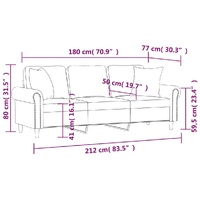 $471.59This 3-seater sofa, standing out with its modern design and throw pillows, will be an excellent place for chatting, watching TV or just relaxing. Soft velvet: Velvet is a soft, luxurious fabric that is recognised by its dense pile of evenly cut fibres that have a smooth nap. Velvet fabric features a distinctively soft feel, making it pleasant to touch.Sturdy and stable frame: The metal frame of the lounge sofa ensures sturdiness and stability.Throw pillows with inserts: These sofa pillows come with PP cotton inserts, so you don't bother to buy fillings.Comfortable seat experience: The sofa is highly comfortable with the thickly padded seats, armrests and back pillows. Besides, the decorative pillows can add extra comfort when you are seated or lying.