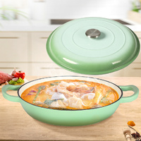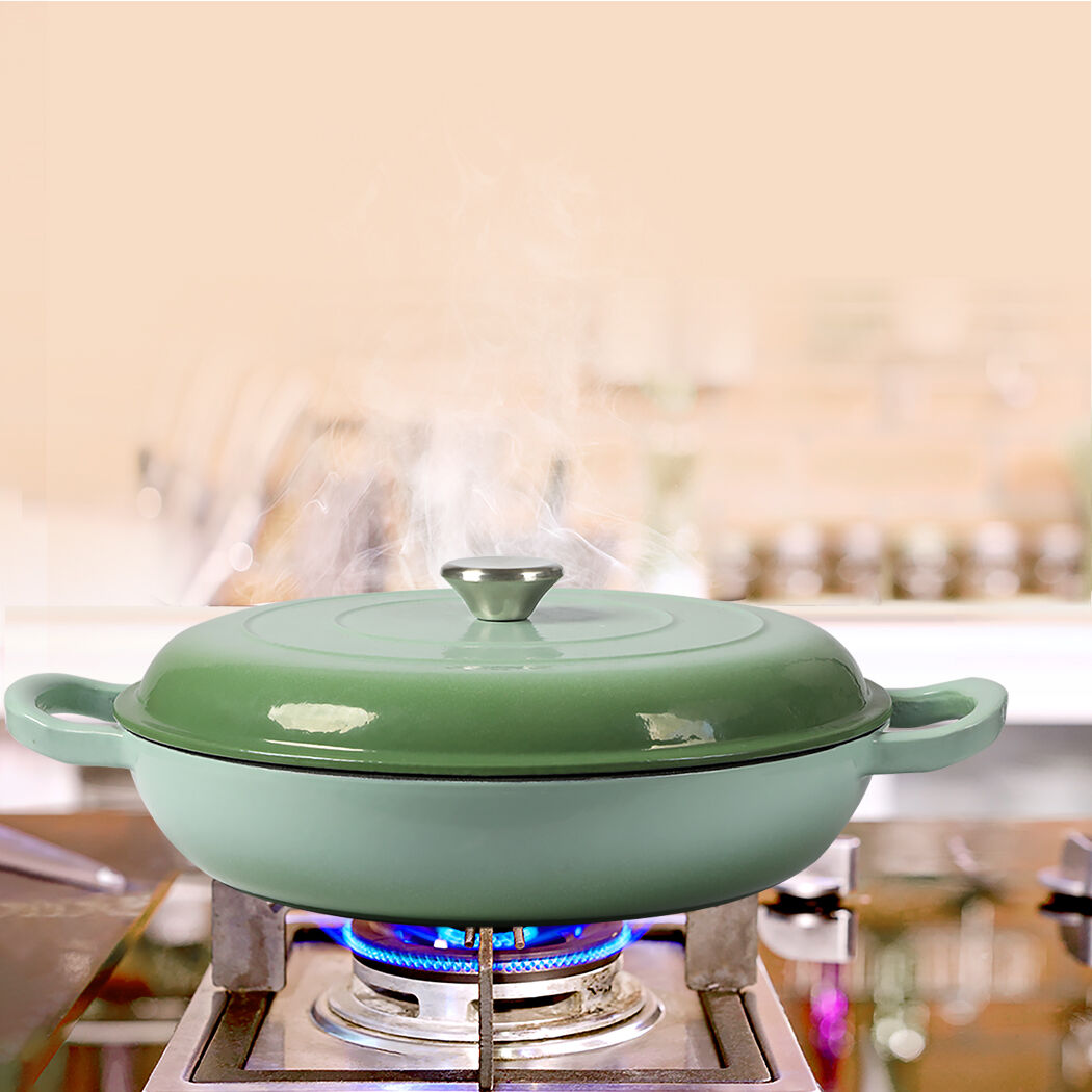 Cast iron pan holds the heat. Fitted lid holds heat in for faster cooking. Stays hotter for longer. You can cook in heavy cast iron for years and years. Non-stick enamel coating last longer than other types of stick coating.