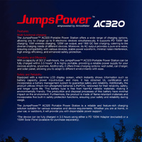 Embrace the future of portable power with the JumpsPower AC320, a robust power station meticulously crafted to keep you connected, no matter where you are. Australian owned and operated, this sleek grey unit is more than just a power supply; it's a symbol of innovation and reliability.