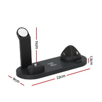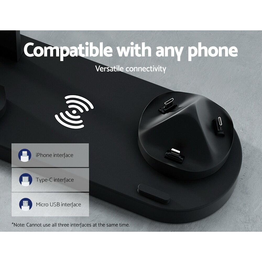 $26.03Charge everything in the same place and all at once with the convenient 4-in-1 Wireless Charger from Devanti. It supports 10W max charging for four devices at once: up to two smartphones, iWatches, Airpods. Forget having to plug in several chargers you can use a single charging station to simplify your life and clean up your desktop. It includes three interface types for most smartphone models, as well as 10W Qi-certified wireless charging. The device features temperature protection, overcharge protection, over-voltage protection and short-circuit protection for a completely safe charging experience. It has a non-slip baffle, magnetic watch charger, 360-degree swivel and a vertical holder design so you can use your phone while charging. Keep your desktop clear and your devices charged with the Devanti 4-in-1 Wireless Charger.