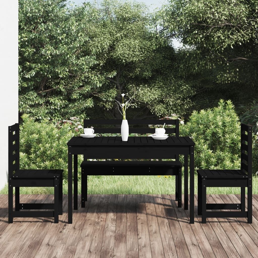 $408.59This classic wooden garden dining set is perfect for outdoor use and is designed to be the focal point of your garden, terrace or patio, etc. Solid pine wood: The dining set is made of solid pine wood. Solid pine wood is a beautiful natural material. Pine wood has a straight grain, and the knots give the material its signature, rustic look.Practical tabletop: This dining table provides you with a sturdy tabletop. You can place your snacks, drinks and any of your favourite decorations.Comfortable seat experience: The slatted seat and backrest of the garden seat offers great support.Wide applications: The outdoor dining set with its simple and timeless design is suitable for balconies, gardens, patios, etc. Note:To make sure your outdoor furniture stays beautiful, we recommend protecting it with a waterproof cover.