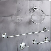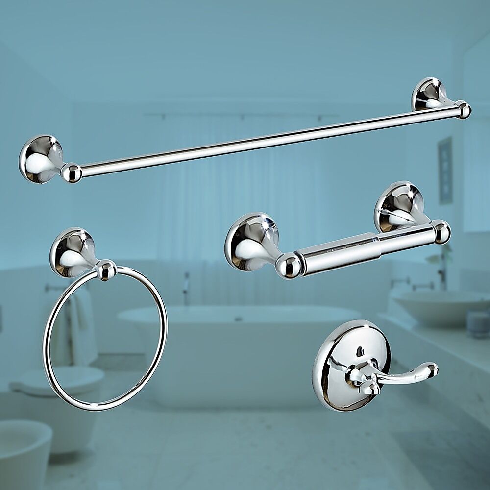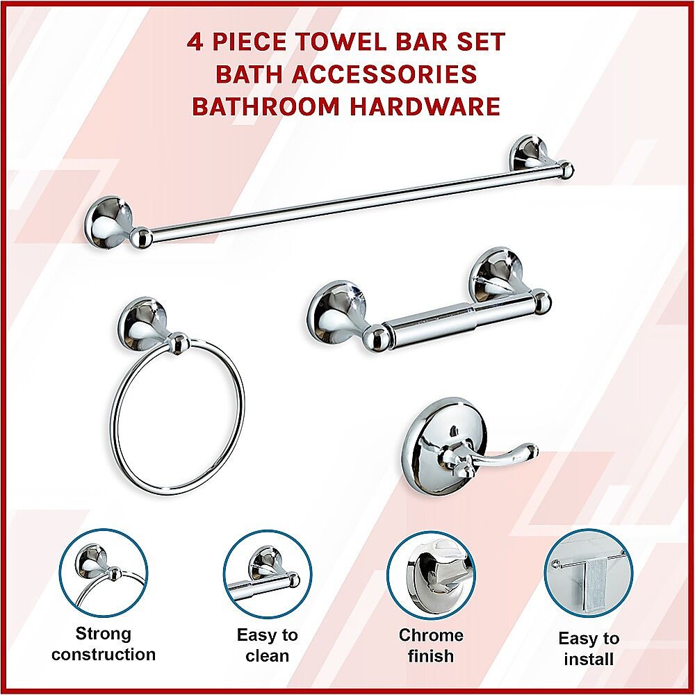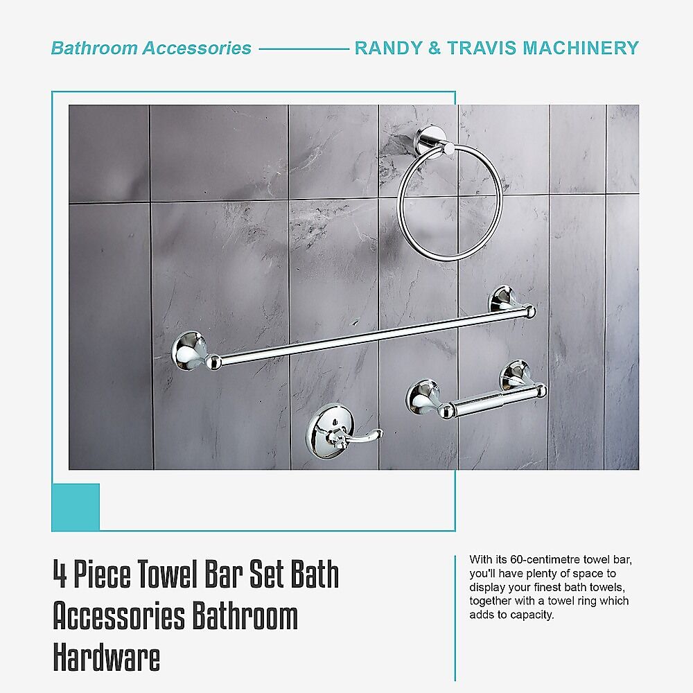 $55.09For a sleek, contemporary look in your bath, this chrome four-piece bath set from Randy Travis Machinery is the perfect choice. With its 60-centimetre towel bar, you'll have plenty of space to display your finest bath towels, together with a towel ring which adds to capacity. A double robe hook and a wall-mounted toilet paper holder complete the set.