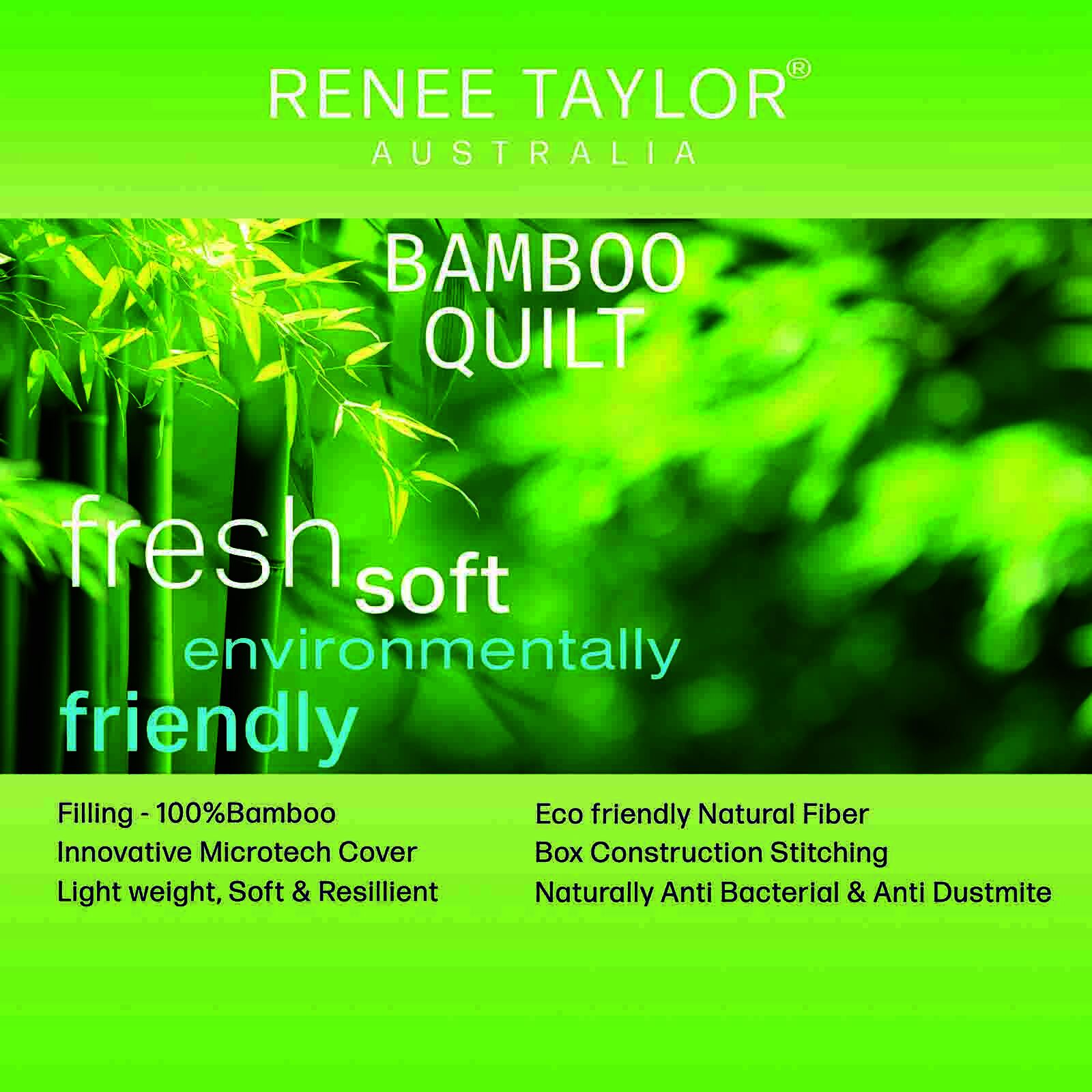 Experience the ultimate comfort and relaxation with the Renee Taylor 400 gsm Bamboo All Seasons Quilt. Made with premium quality bamboo fill, this quilt is luxuriously soft and eco friendly.The quilt is lightweight and breathable to give you a wonderful night?s sleep. Even fill distribution is made possible by the end-to-end box stitching construction, so the quilt remains tidy and comfortable even after numerous washings.
