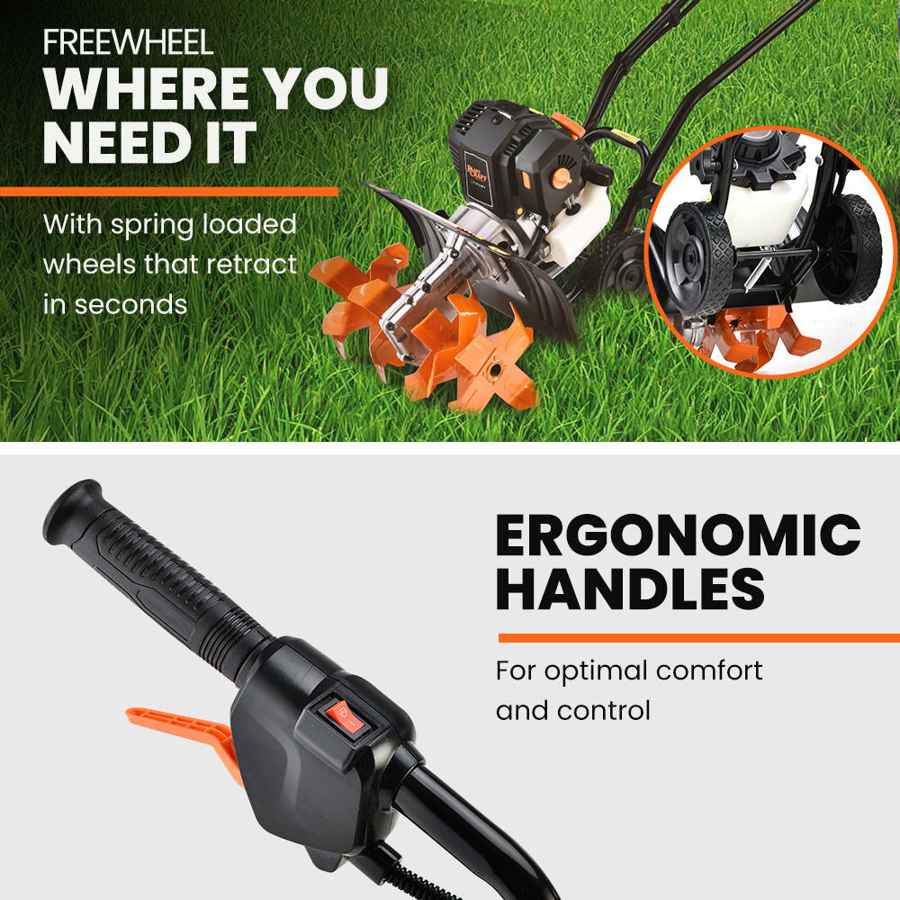 The premium 46cc OHV powerful easy-start 4-stroke engine is powerful enough to turn up dry compacted soil along with the benefits of quieter operation, less vibration, less smoke and no fuel mixing hassles!