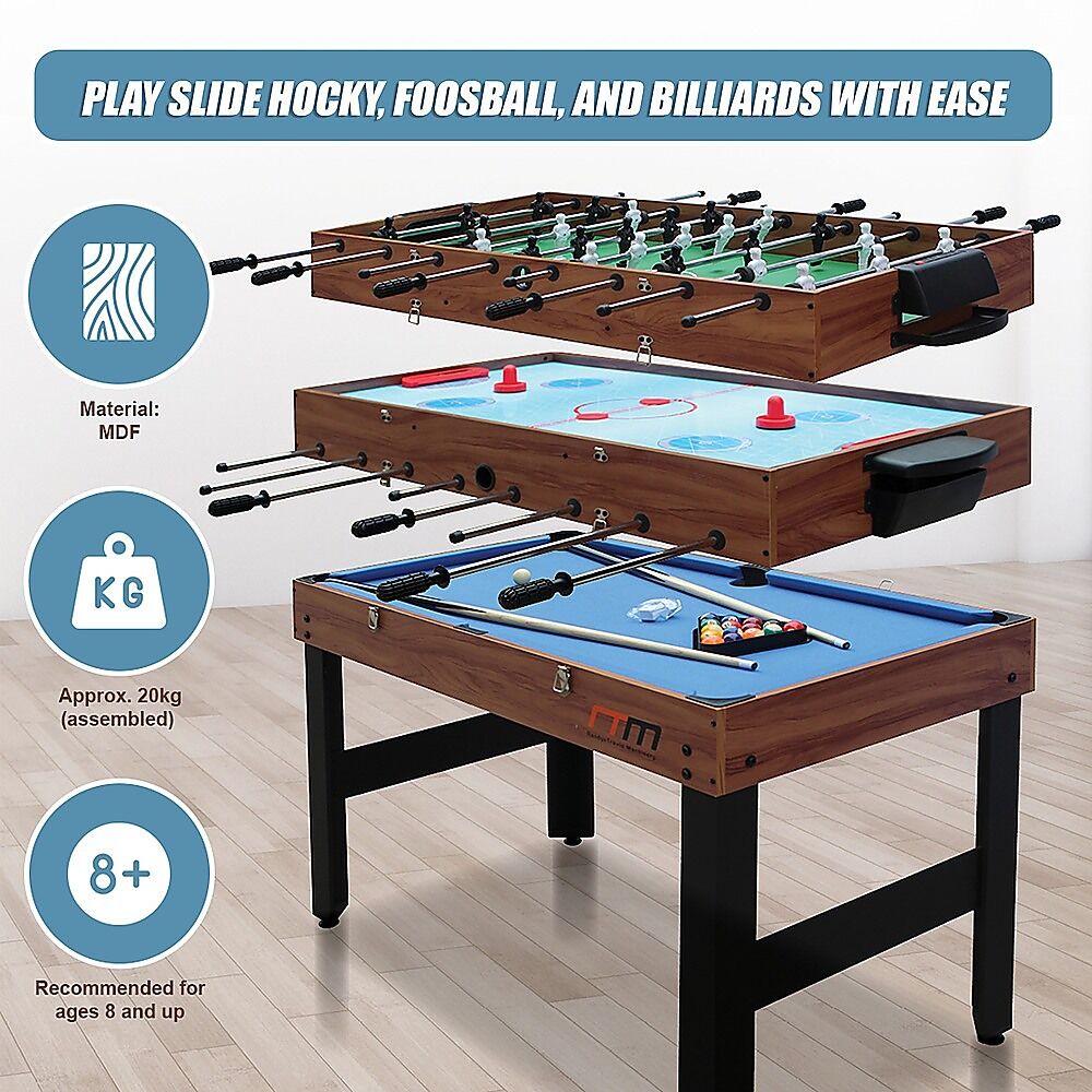 $393.29No matter what your favourite table game, you'll find something you love with this convertible three-in-one game table from Randy Travis Machinery. Featuring a fun-size pool table, a foosball table, and a slide hockey game, this table saves space, converting from one game to another in mere seconds. With a manual scoring system, you can keep track of points, while a built-in storage area stashes away game accessories to keep you organised.