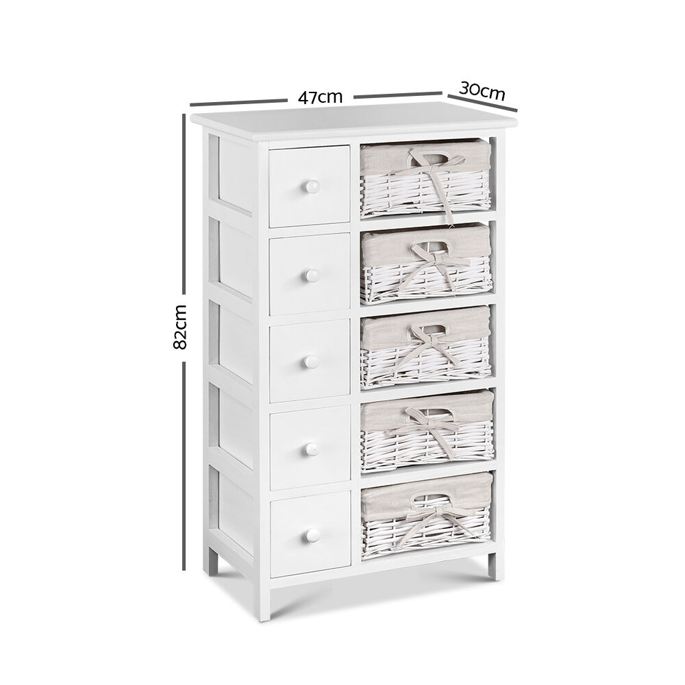 Looking for that cottagecore aesthetic without moving to the countryside? Add a chic, rustic presence to your home with the Artiss 5-basket Cabinet. Beautifully crafted in an endearing combination of Paulownia wood, MDF board, plywood and PP material, this cabinet evokes a charming, simple living feel and is useful in so many ways. The design has a timeless appeal, and its practicality is enhanced by the five deep drawers and five movable baskets with cloth liners that are washable for easy maintenance. The cabinet will match perfectly with your existing décor thanks to its neutral white tones, so you can use it in any room. Not least, the anti-scratch feet pads will help to keep your floor in pristine condition. The cabinet comes fully assembled so you can place it straight out of the box. Get yours today and create your perfect home.