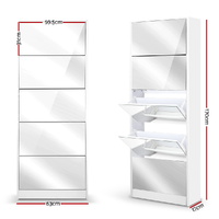 $162.44A practical and stylish shoe cabinet. And a full-length dressing mirror. Two absolute essentials that any discerning fashionista needs. And you can now have both in one with our Artiss Mirror Shoe Cabinet. The five storage compartments are pull-down for easy access and up to 25 of your favourite pairs would fit comfortably in them. Made of 15mm thick particle board with melamine finish, the shoe cabinet is strong and durable to withstand daily robust use. The mirror front of the closed compartments becomes a clear and bright full-length mirror for convenient matchups of clothes and shoes. Or just a quick check before heading out. Not least, the contemporary handle-less design definitely lends a touch of elegance to any home. So clear the clutter and reflect your elegant style with our mirror shoe cabinet.