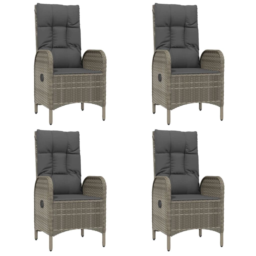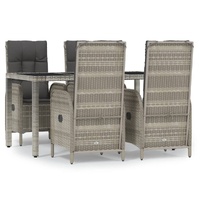 $865.82This trendy garden dining set, featuring an elegant and contemporary design, is a great choice for dining or relaxing in your garden. Weather-resistant material: PE rattan, also known as poly rattan, is weather resistant and easy to clean. It remains beautiful on the outside for a long period of time. It offers great quality, convenience and an aesthetic look.Sturdy frame: The powder-coated steel frames make the outdoor dining set sturdy and stable for daily outdoor use.Practical tabletop: The smooth tabletop of the garden table is made of tempered glass which is easy to clean with a damp cloth. Additionally, the sturdy tabletop is perfect for placing meals, drinks, and other decorative items.Reclining function: The garden chairs are specially designed with a reclining function so that you can adjust the backrest as per your comfort.Comfortable seat experience: The backrest adds extra seating comfort for the garden chair. Also, the thickly padded cushions provide comfort for your sitting time. Good to know:To make assembly as easy as possible, each product is delivered with a manual. Note:To make sure your outdoor furniture stays beautiful, we recommend protecting it with a waterproof cover.