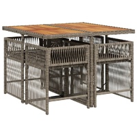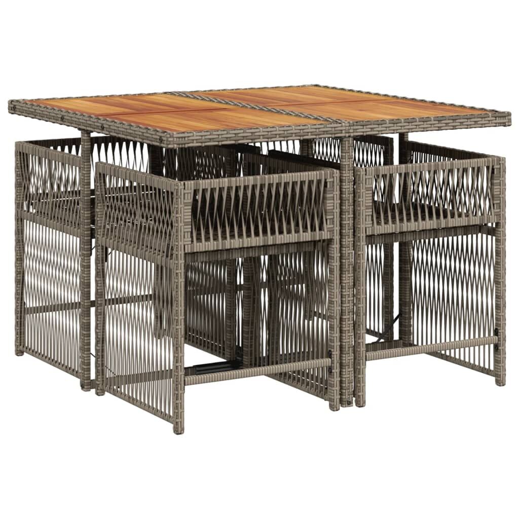 $397.10This garden dining set is a great choice for al fresco dining or just relaxing in the garden, backyard, or patio. Durable material: PE rattan, also known as poly rattan, is a strong, low-maintenance synthetic material that looks like natural rattan. It's lightweight, easy to clean, and commonly used for outdoor furniture due to its durability and weather-resistant properties.Compact storage: These chairs have a flap backrest that can be folded down, making it easy to store them under the table. When folded, they neatly fit under the table, forming a space-saving cube shape.Comfortable seat experience: This outdoor furniture, complete with thickly padded cushions, offers a comfortable seating experience.Removable and washable cover: These seat cushions feature removable covers for easy washing and maintenance. The cushion covers have a flap at the back for easy attachment to the backrests.Stable and easy-to-clean tabletop: This garden table has an acacia wood top that is sturdy, durable, and easy to clean with a damp cloth. Good to know:To make sure your outdoor furniture stays beautiful, we recommend protecting it with a waterproof cover.