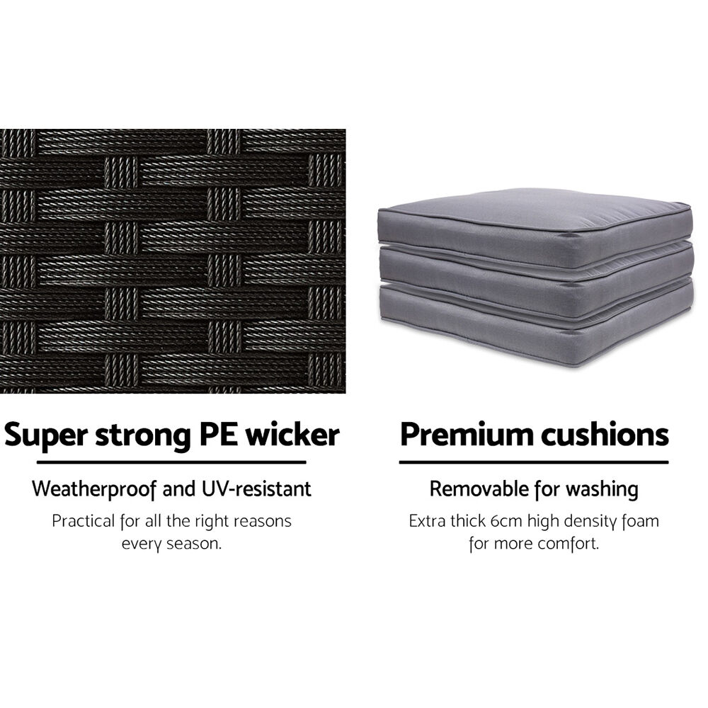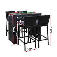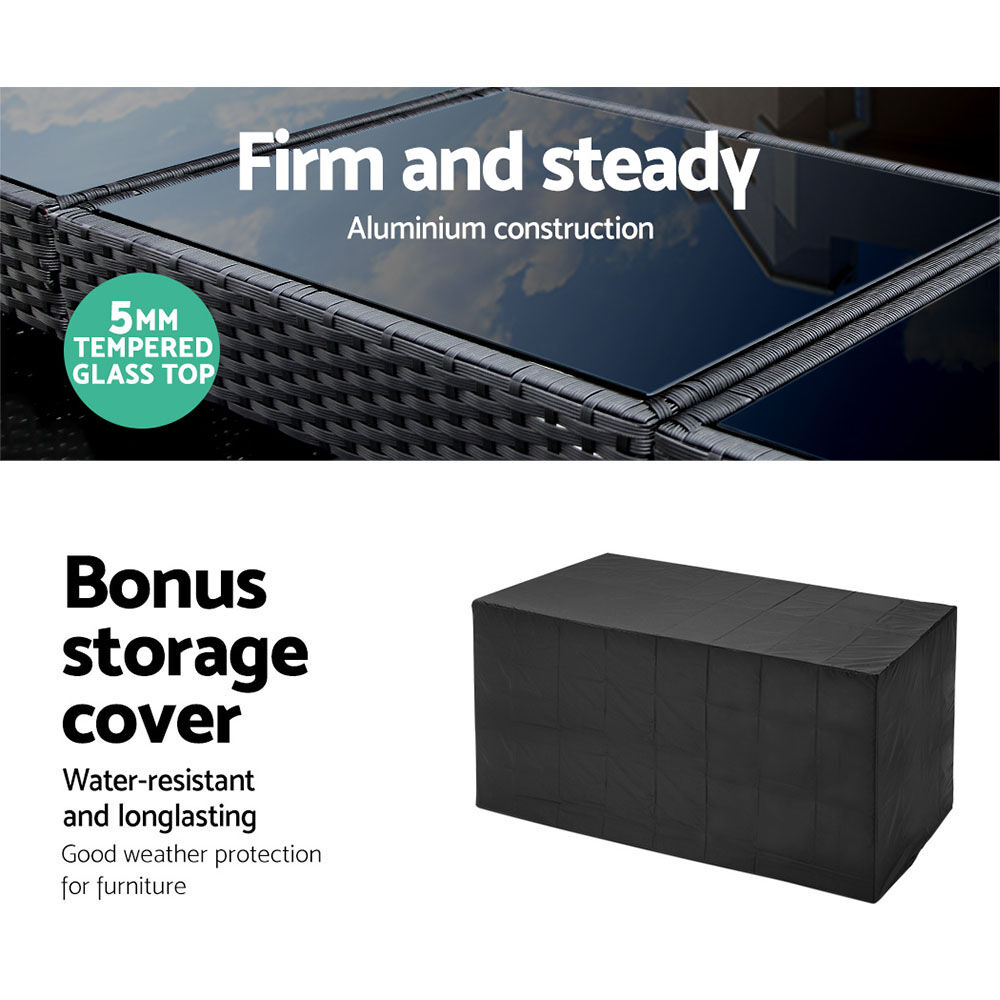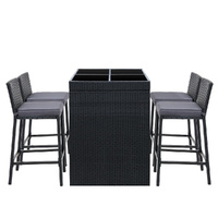 $402.68Looking as stunning as ever in an upgraded design, our Gardeon Outdoor Bar Set certainly deserves its coveted space in your lovely backyard, deck or patio. With its chic and trendy profile, the bar set comes with a table and matching bar stools, with ample seating for all your friends and family. And as the seats have inclined backrests and extra-comfy 5cm thick foam cushions, you can socialise for hours on end without aching backs or bottoms. If you spill your drink, the 5mm tempered glass tabletop and removable seat cushion covers make cleaning up hassle-free. With powder-coated steel construction and quality PE wicker finish, the bar set is designed to handle the rain and sun without any worries for years to come, and there is also a bonus water-resistant storage cover included for added protection. When not in use, you can save loads of space simply by pushing the chairs under the table, as the bar set has a space-saving integrated design and fits together perfectly like a puzzle.