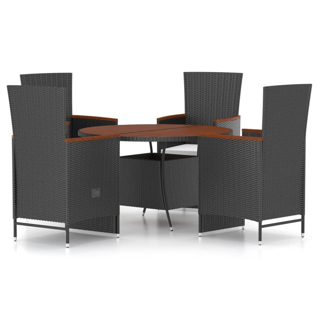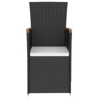 $754.22This outdoor dining set, with an elegant and contemporary design, is an eye-catching addition to your outdoor living space. This garden furniture set features a sturdy powder-coated steel frame, which is very stable and durable. The PE rattan makes this dining set easy to clean, hardwearing and suitable for daily outdoor use. The tabletop is made of solid acacia wood, a tropical hard wood, which is weather-resistant and durable. The reclining chairs offer the utmost seating comfort and great support. The backrest is easily adjustable as per your desire by using the button on the side. The footrest can also be moved up for a comfortable lying position. Additionally, the thick and soft seat and back cushions are also highly comfortable. The low-maintenance polyester cushion covers can be easily removed and washed. Note: We recommend covering the set in the rain, snow and frost for extended life.