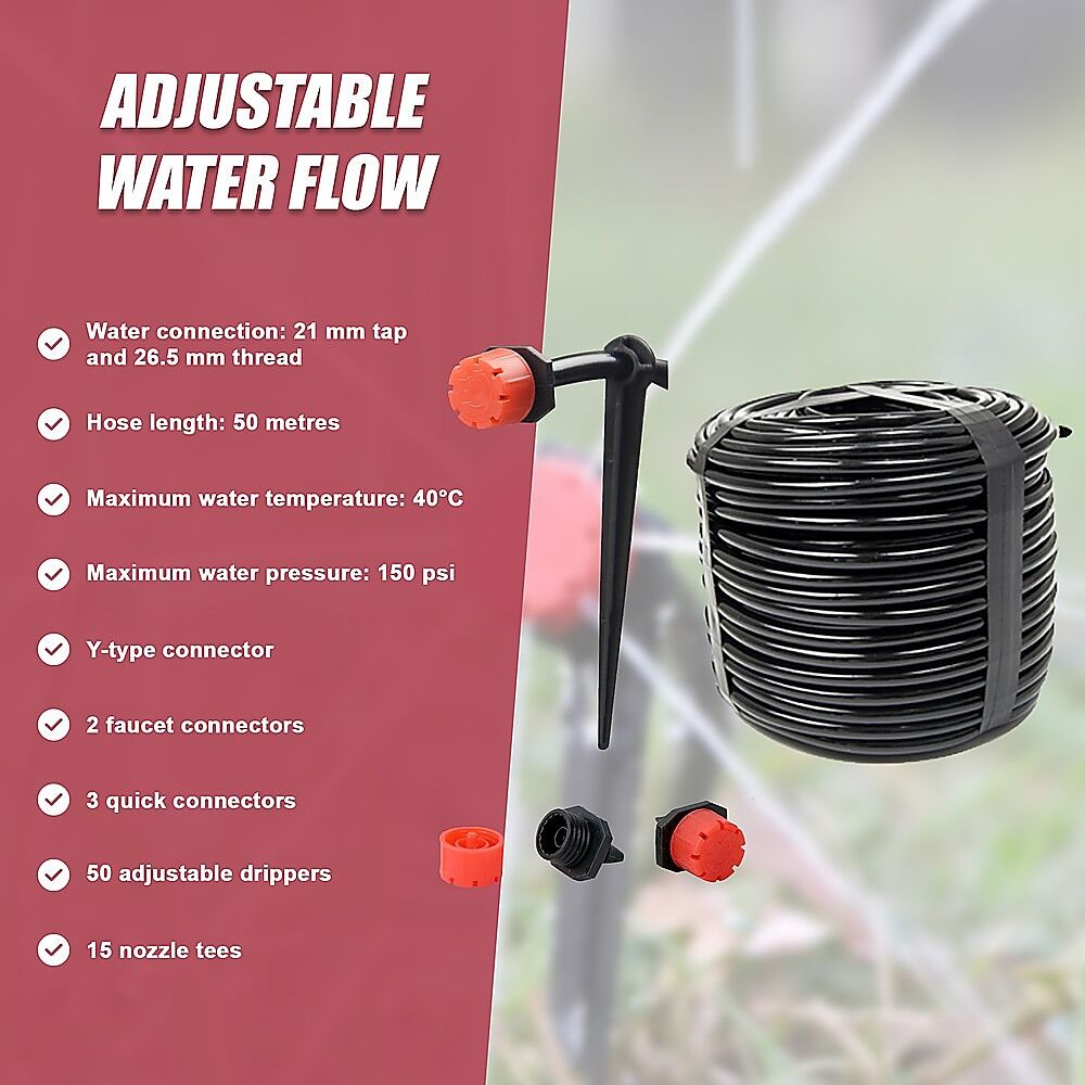 If you need two water lines of shorter length, you can easily cut the hose tubing to customise your application. With the Y-shaped faucet connector, you can run each line in a different direction, depending on the shape of your garden. It comes with drip heads that you can adjust for individual plants' needs or turn completely off for plants that need only an occasional rain to keep them happy. This versatile system has applications outside the garden as well. Use it for your lawn, to cool down your balcony or patio, or even in your greenhouse to mist your plants. And, with everything needed to care for a garden all year round, this system makes a great gift for gardening enthusiasts of all ages. Order one today for you or that special gardener in your life!