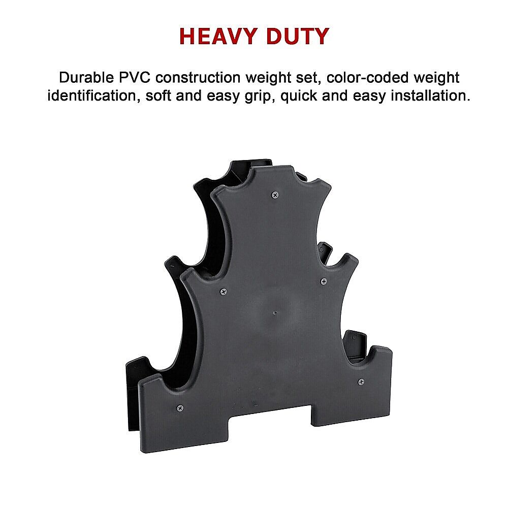 You'll receive 3 sets of colour-coded weights: 2 x 0.5kg weights (blue), 2 x 1kg weights (purple), and 2 x 1.5kg weights (red). The weights are made with a durable PVC material that's tough enough to withstand your intense workout sessions. Your purchase is complete with a convenient pyramidal rack which neatly stores all your weights.