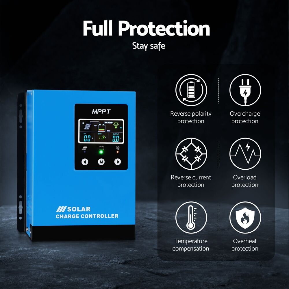 $206.09Keep your batteries from overcharging with a 60A MPPT solar charge controller from Giantz. Creative MPPT technology results in up to 99 per cent tracking efficiency and up to 97 per cent maximum charging efficiency. Multi-stage charging maximises your battery health, charge and lifespan. The controller features intelligent protection in case of overcharge, reverse polarity, overloading, overheating, etc. The humanised design with a backlit LCD display is easy and convenient to use. Works with most popular battery types for seamless integration. The iron case heat sink and cooling fan ensure proper heat distribution. Features RS485, RJ45 port communication modes for fast and accurate communication across devices. The controller automatically detects system voltages. Max PV input power: 12V/780W, 24V/1560W, 36V/2340W, 48V/3120W. Power up anywhere with a 60A MPPT solar charge controller from Giantz.