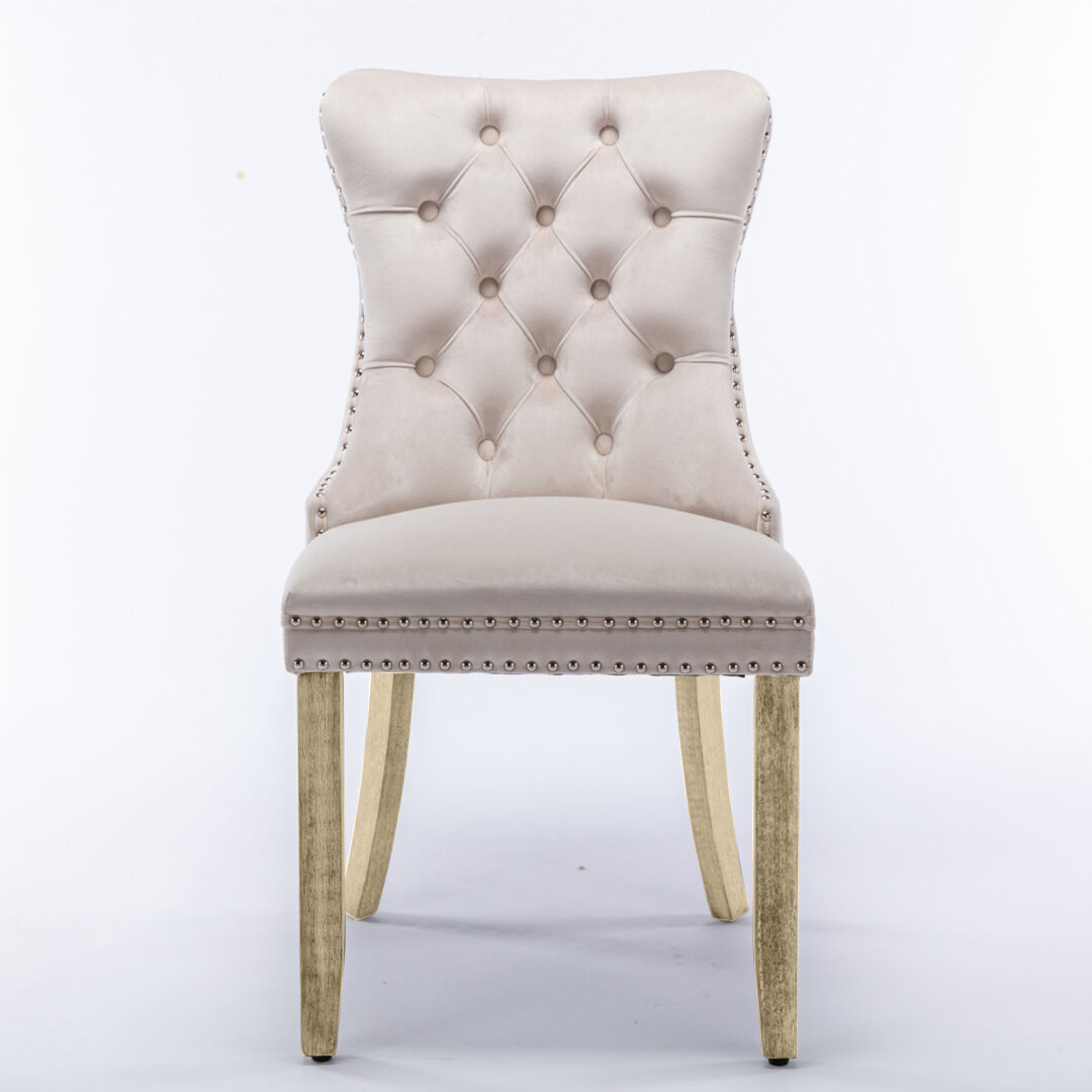 6x Velvet Dining Chairs Upholstered Tufted Kithcen Chair with Solid Wood Legs Stud Trim and Ring-Beige