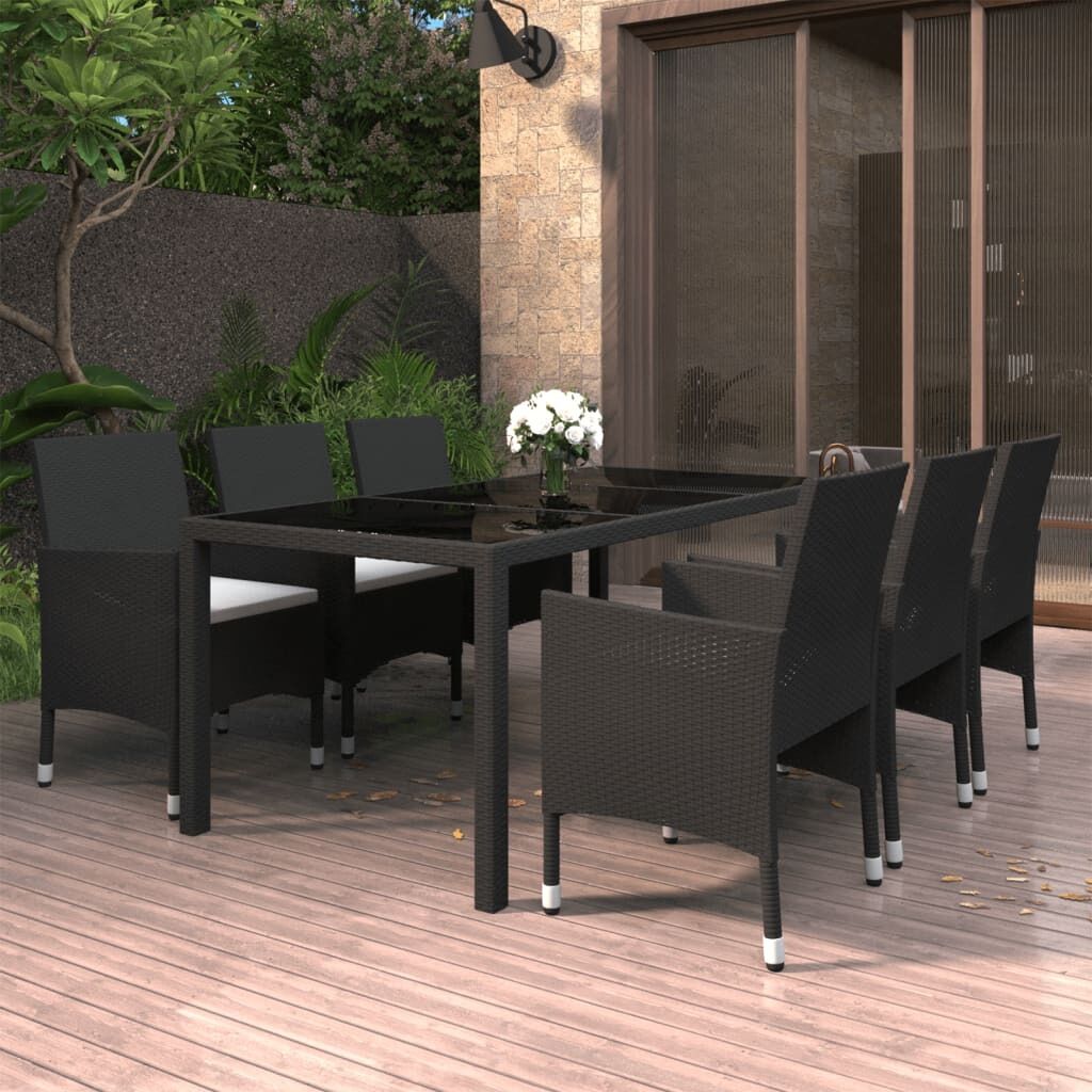 $801.89This garden dining set, featuring an elegant design, is an excellent choice for your dining or lounging on your patio or garden. Strong frame: Featuring a powder-coated steel frame covered with weather-resistant PE rattan with UV protection, the table and chairs are durable and stable.Comfortable chairs: The garden chairs are designed in a more ergonomic shape for maximum comfort. Cushions are included for added support.Practical table: The tabletop is made of tempered glass in strong support, easy to clean and maintain. Note:In order to extend the life of your outdoor furniture, we recommend you to clean it regularly and do not leave it outdoors without protection unnecessarily.Clean: Use a mild soap solution.Storing: If possible, store in a cool, dry place indoors. If the product is stored outdoors, protect it with a waterproof cover. Wipe and dry the excess water or snow from flat surfaces after a rain or snowfall. Allow sufficient air circulation to avoid moisture-related damage.