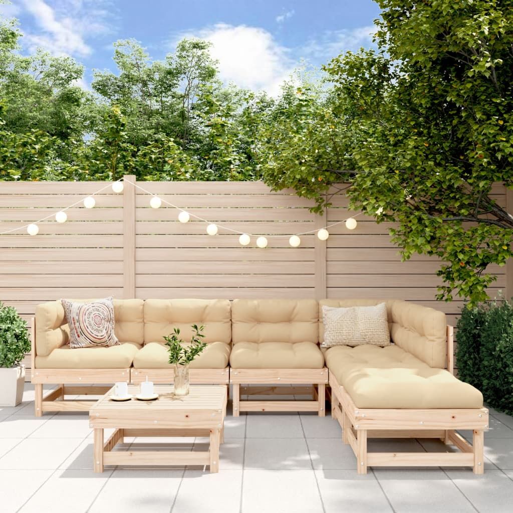 $863.99This wooden garden lounge set, standing out with the slatted design and soft cushions, will make a great addition to your garden, patio, or terrace for enjoying a cosy time with your family or friends. Solid pine wood: Solid pine wood is a beautiful natural material. Pine wood has a straight grain, and the knots give the material its signature, rustic look.Sturdy and stable frame: The wooden frame makes the lounge set sturdy and stable for daily outdoor use.Comfortable seat experience: The backrest and armrest add extra seating comfort for the garden furniture set. Also, the thickly padded cushions provide comfort for your sitting time.Modular design: The sofa set is flexible and easy to move around. You can combine it with other modular segments in the webshop to create your own personal garden lounge set configurations! Good to know:To make sure your outdoor furniture stays beautiful, we recommend protecting it with a waterproof cover.