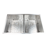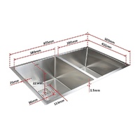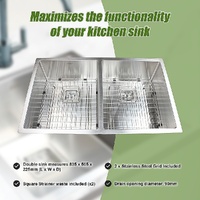 This double sink is made from 1.5mm-thick Type 304 stainless steel with a satin finish for a brilliant look that will last and last. It measures 835 x 505 x 225mm (L x W x D) with 90mm drain openings. Two Square strainer wastes are included. Sinks are equally sized at 380 x 455mm. Installation is Undermount / Topmount-style.